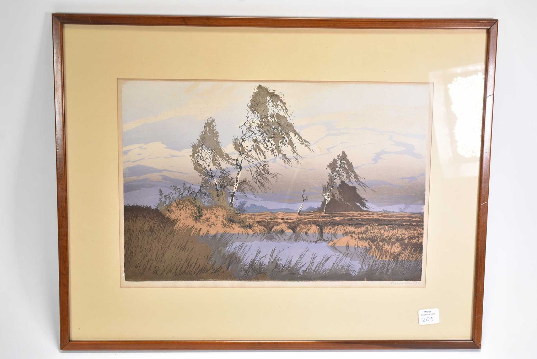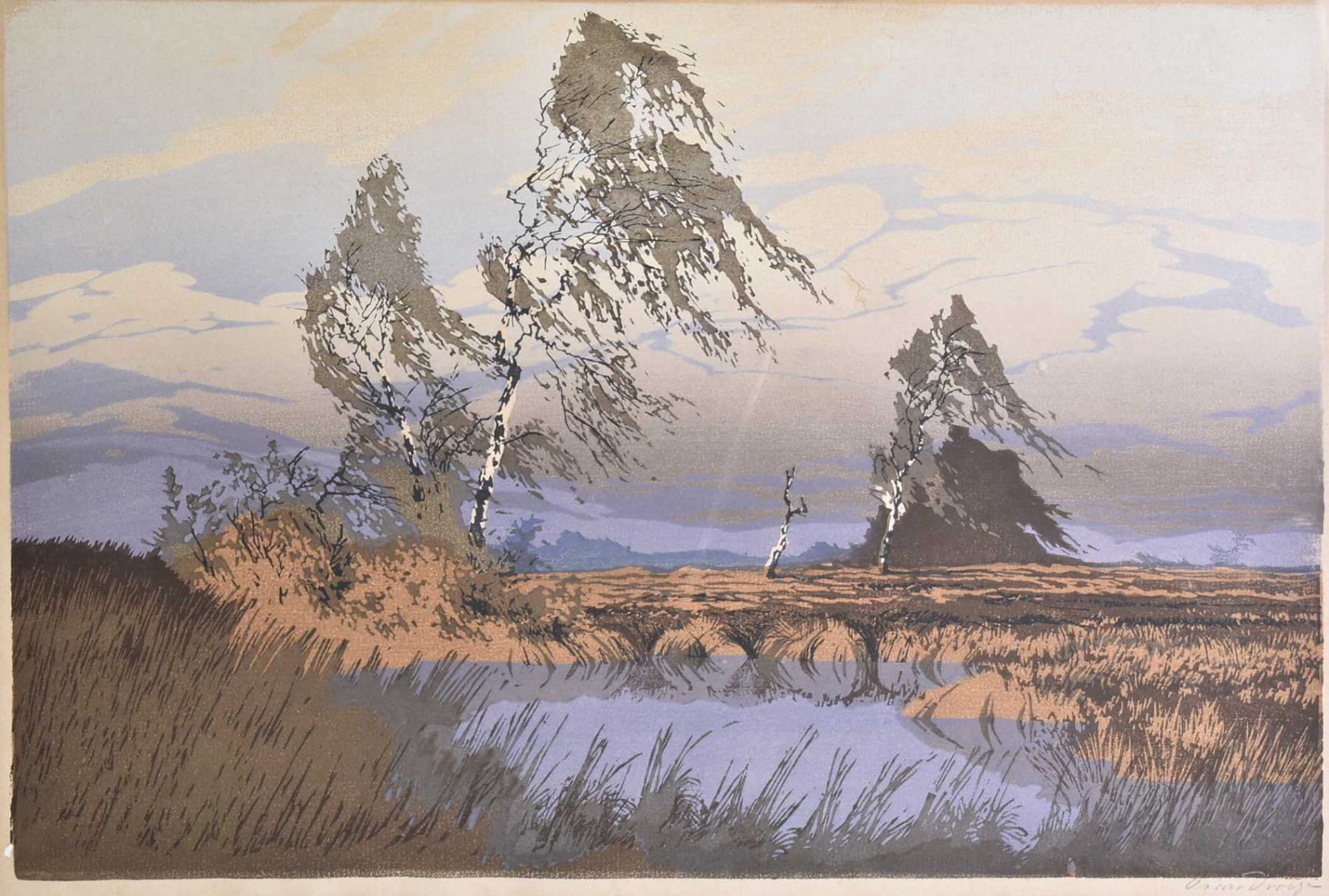 Vintage multi-coloured block print of birch trees in a storm pencil signed by artist Oscar Droege, note small blemish, see photos for details