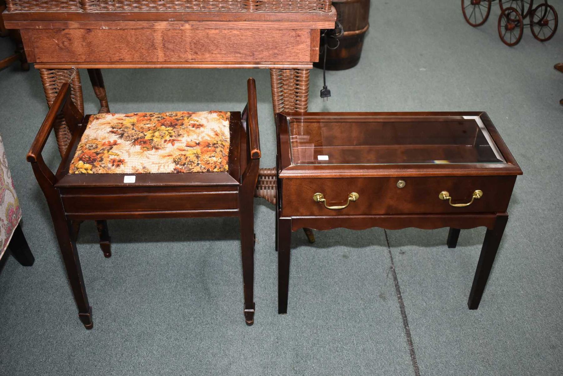 Vintage organ bench with upholstered seat and lift lid storage plus a small display vitrine