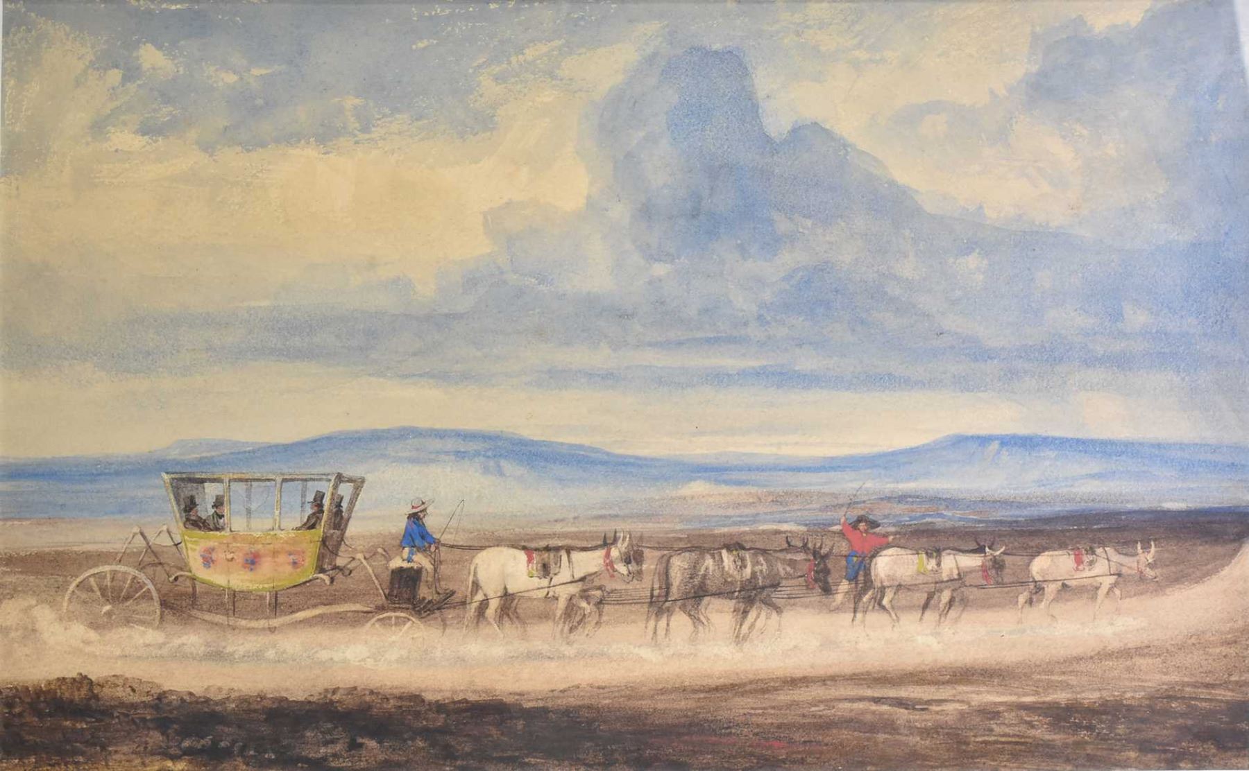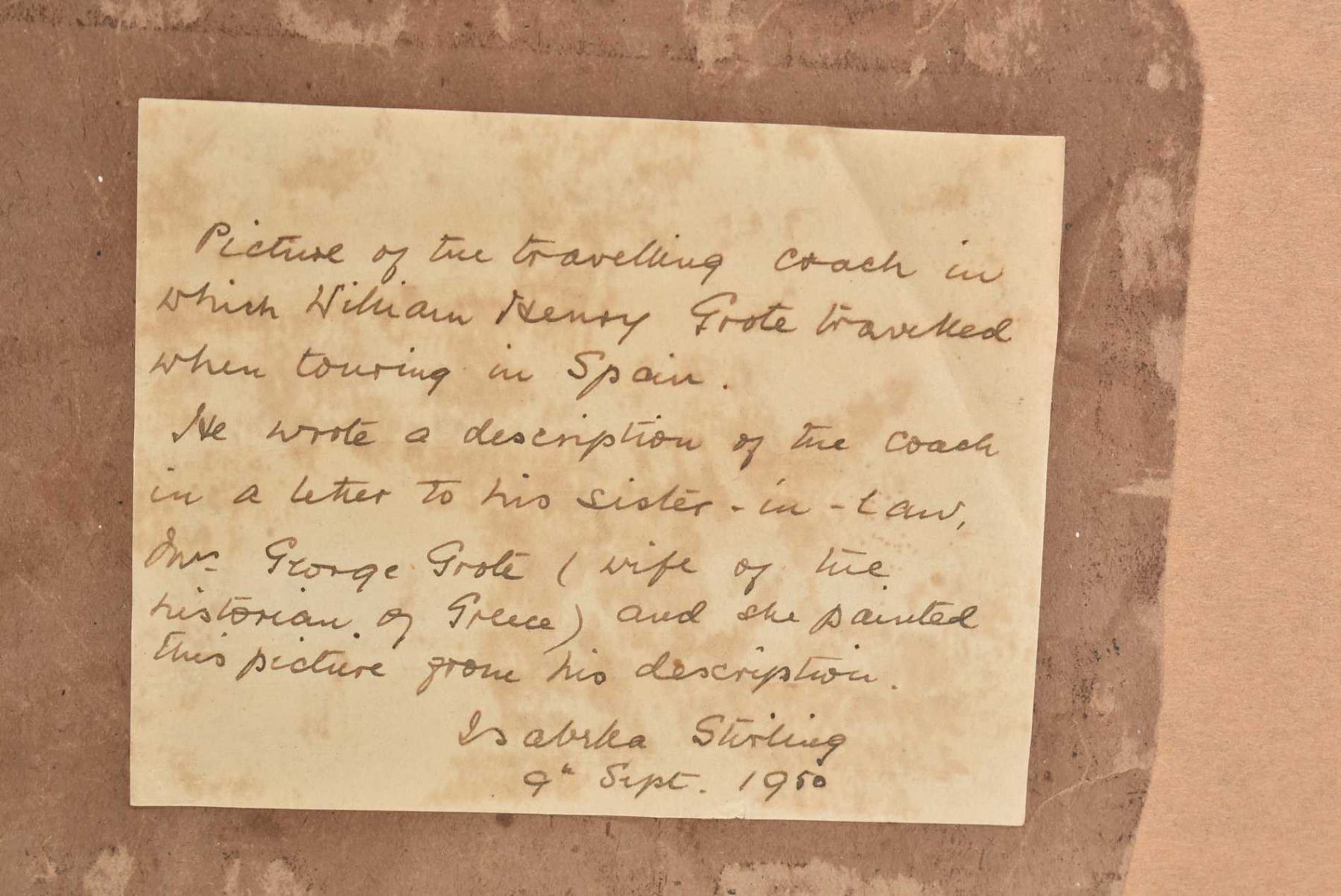 Vintage pencil and chalk drawing on paper in burl wood framed of a traveling coach in Spain with personalized label on verso, see photos, 10" X 15"