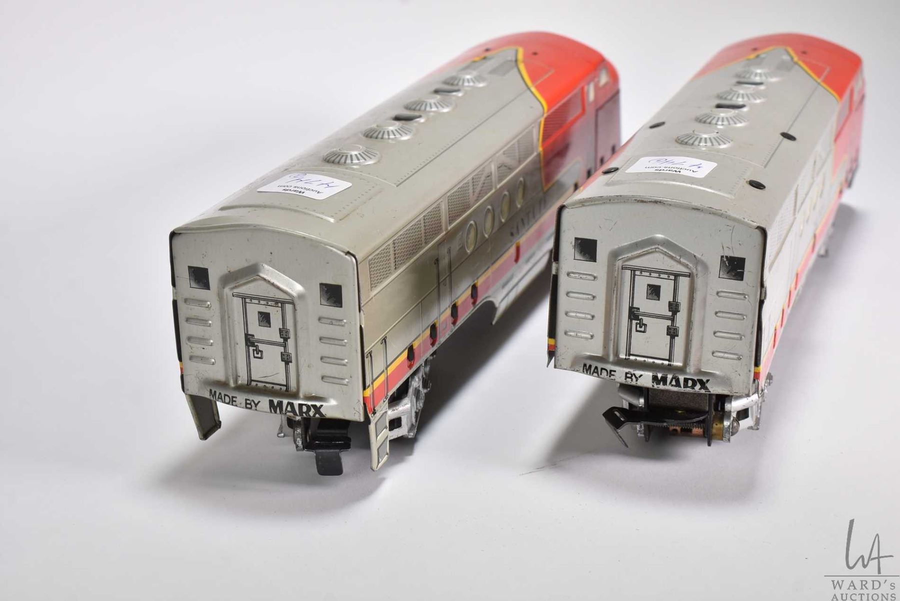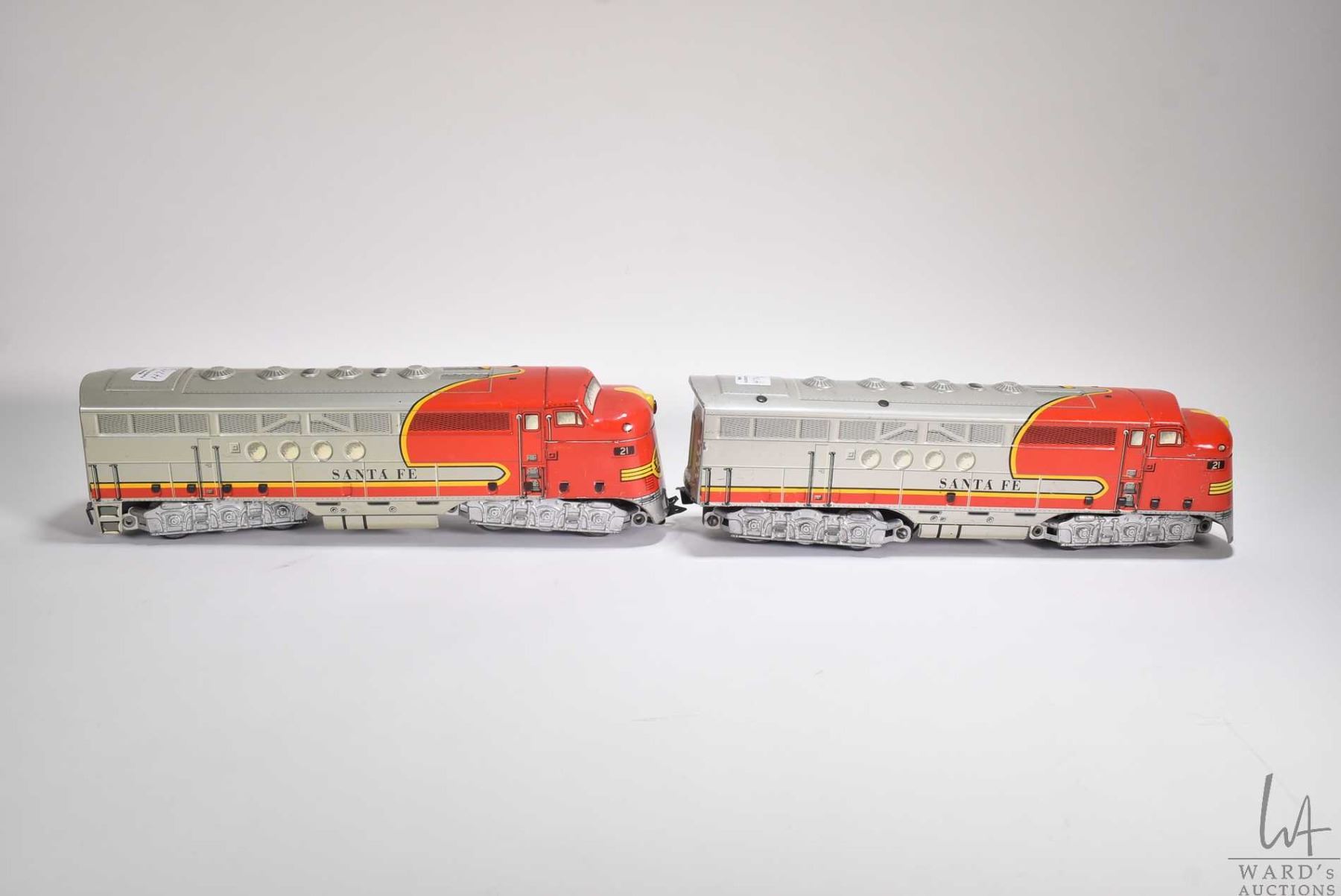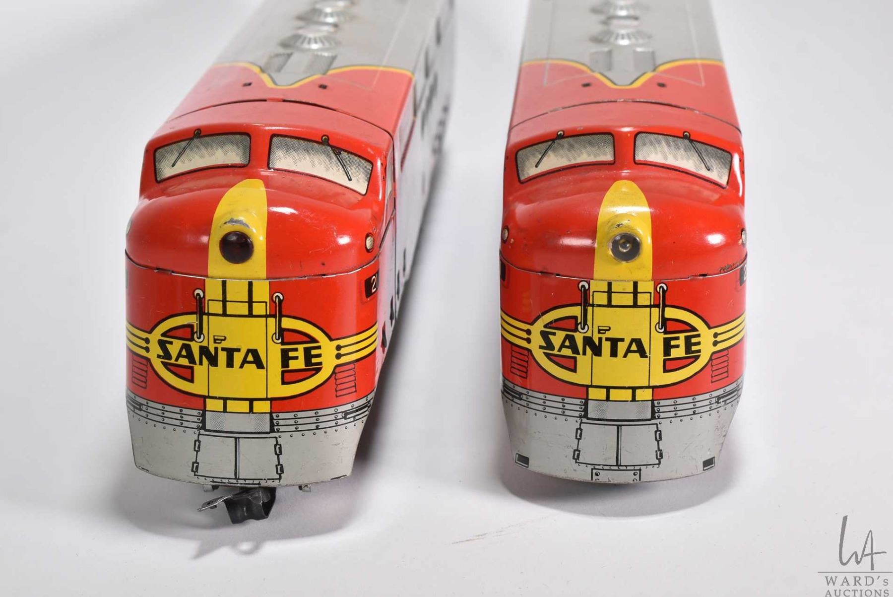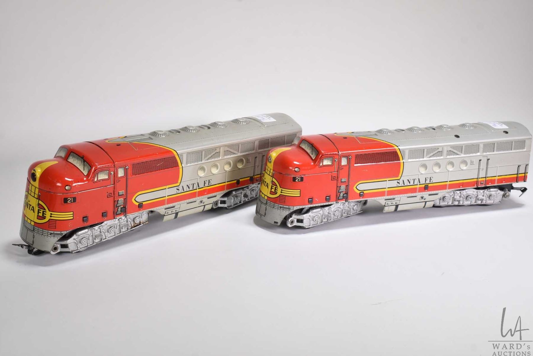 Vintage pressed steel Santa Fe No. 21 double engine train made by Marx circa 1950, O gauge, both together measure 25"