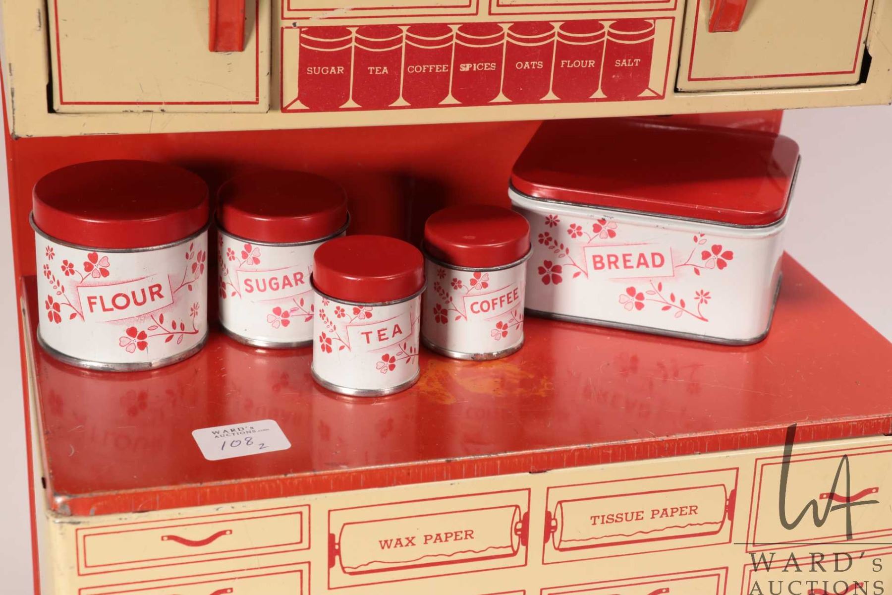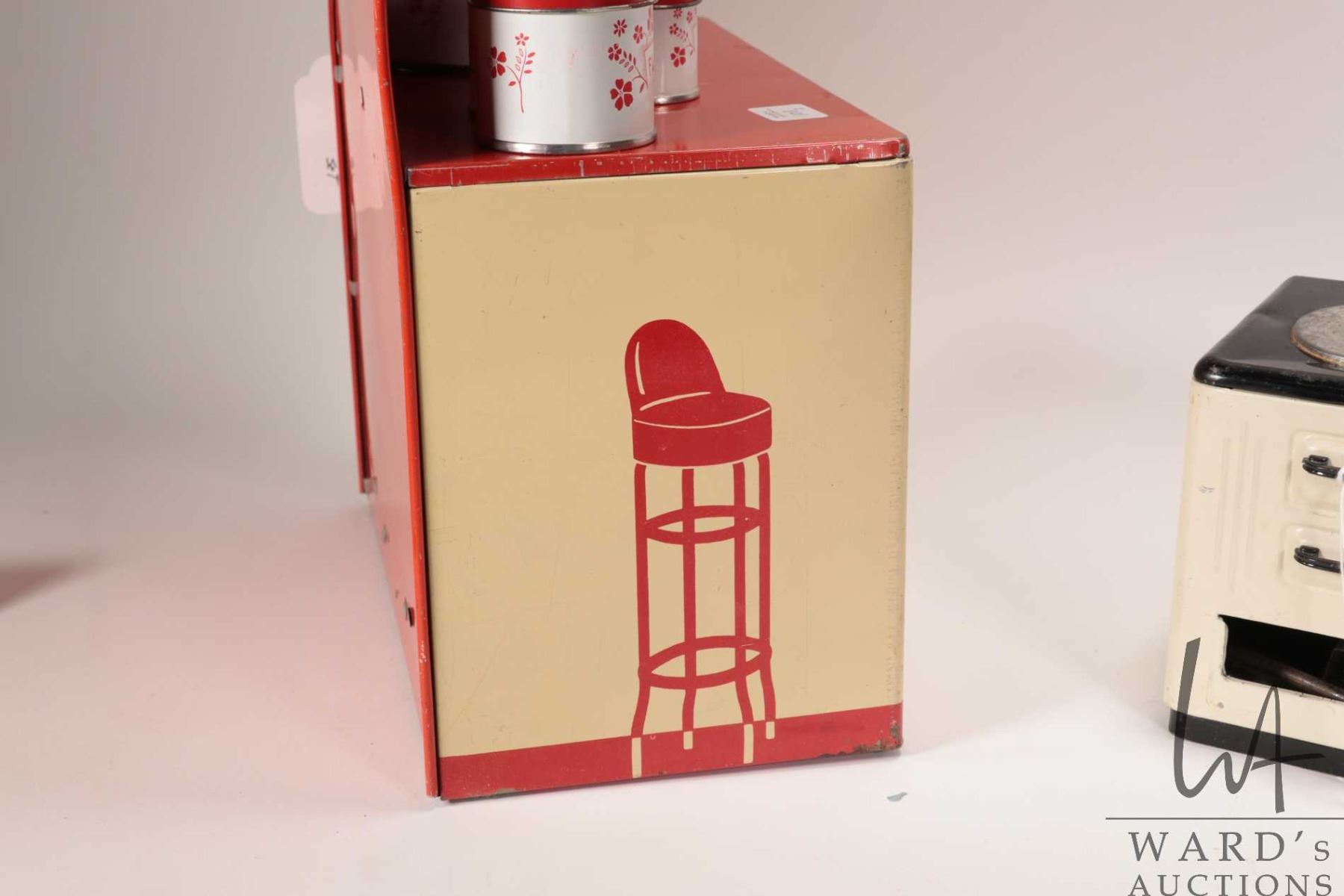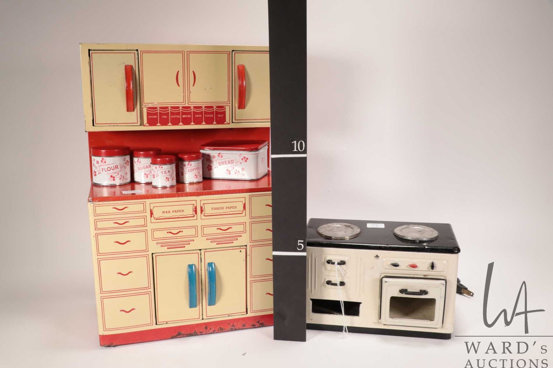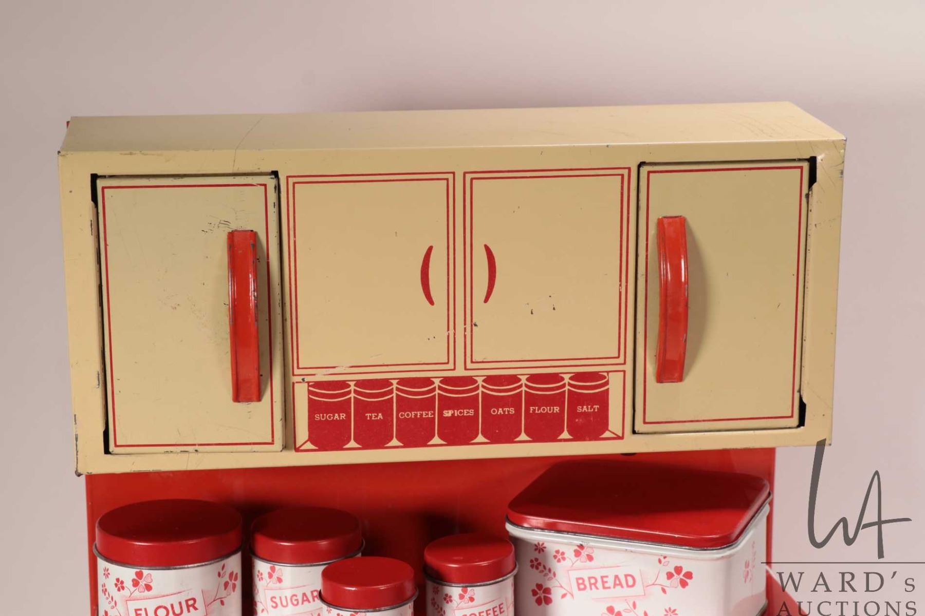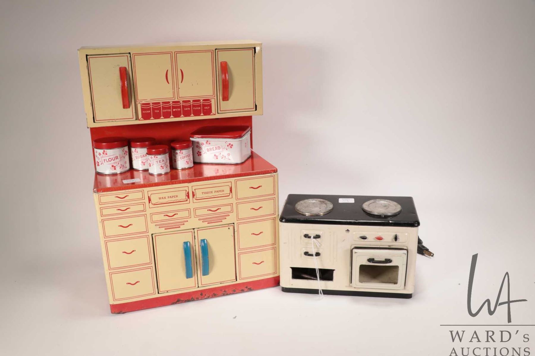 Vintage pressed tin kitchen cabinet 16" H 11" W X 6" D, plus a five piece kitchen canister set including bread bin and a pressed tin stove