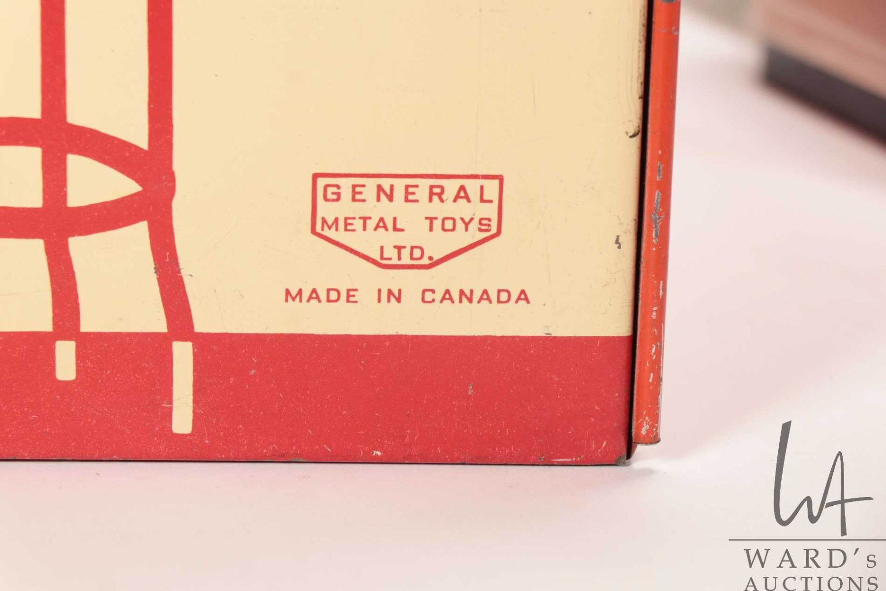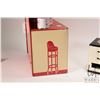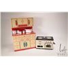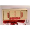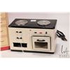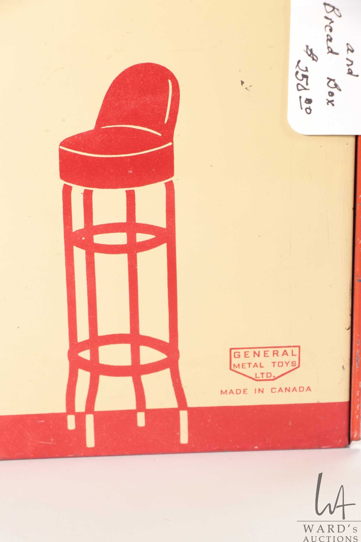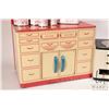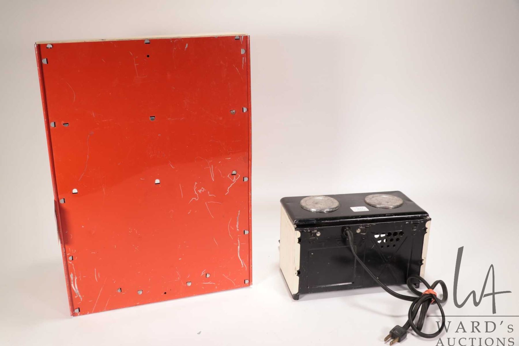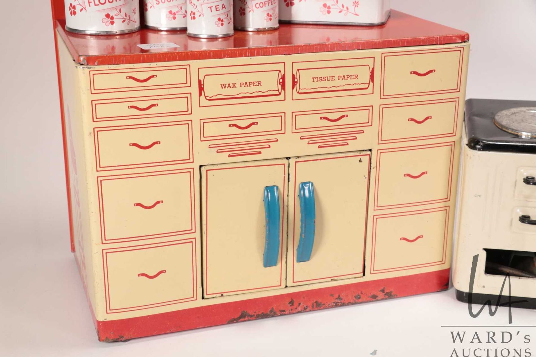 Vintage pressed tin kitchen cabinet 16" H 11" W X 6" D, plus a five piece kitchen canister set including bread bin and a pressed tin stove