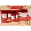 Vintage pressed tin kitchen cabinet 16" H 11" W X 6" D, plus a five piece kitchen canister set inclu