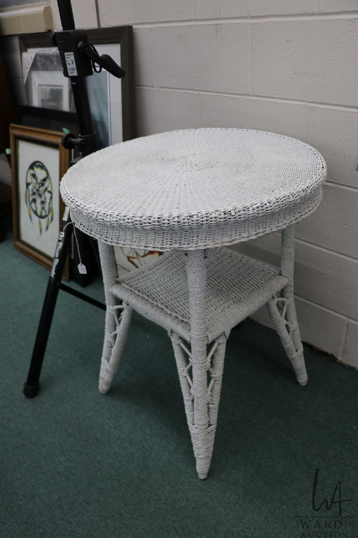Vintage quality white wicker occasional table with under shelf, 28  H X 23  D