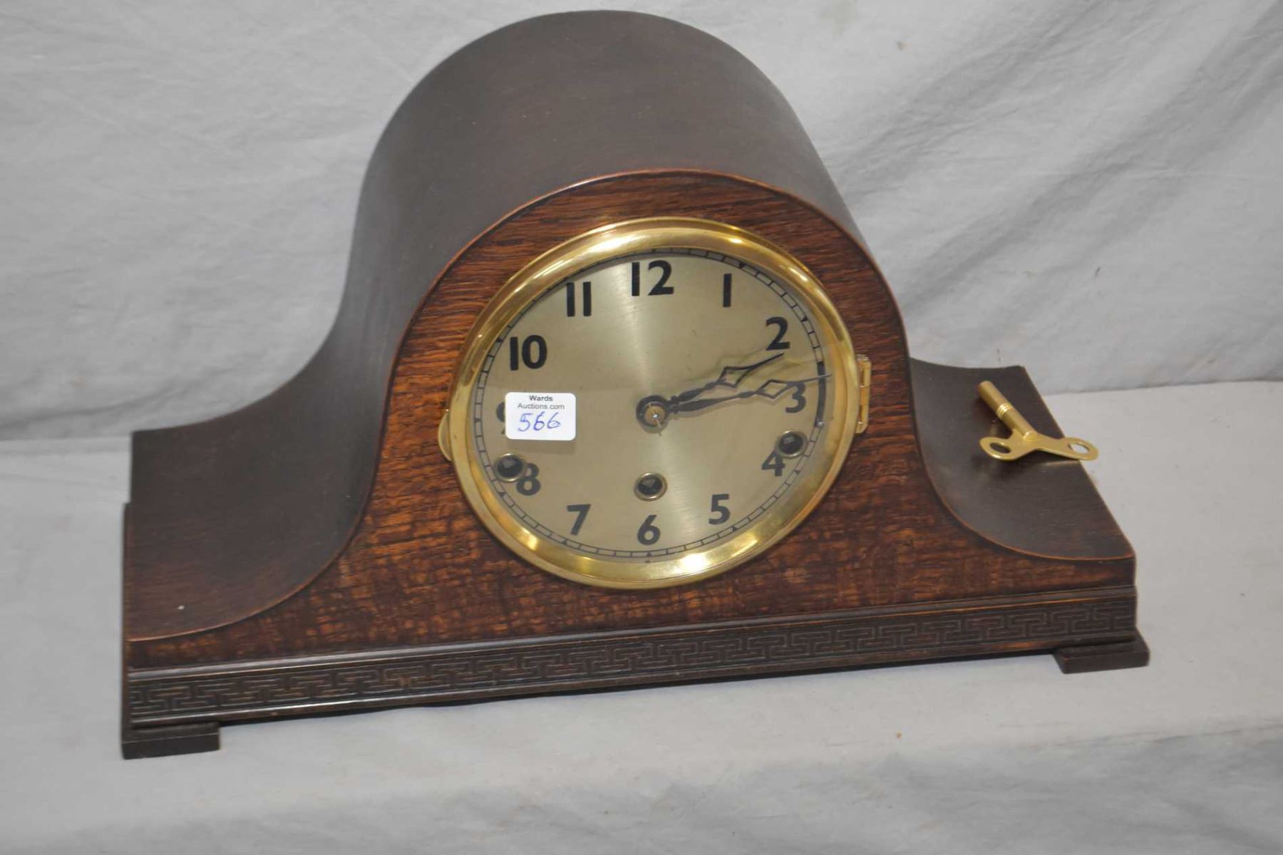 Vintage quarter cut oak top hat triple train mantle clock, working at time of cataloguing