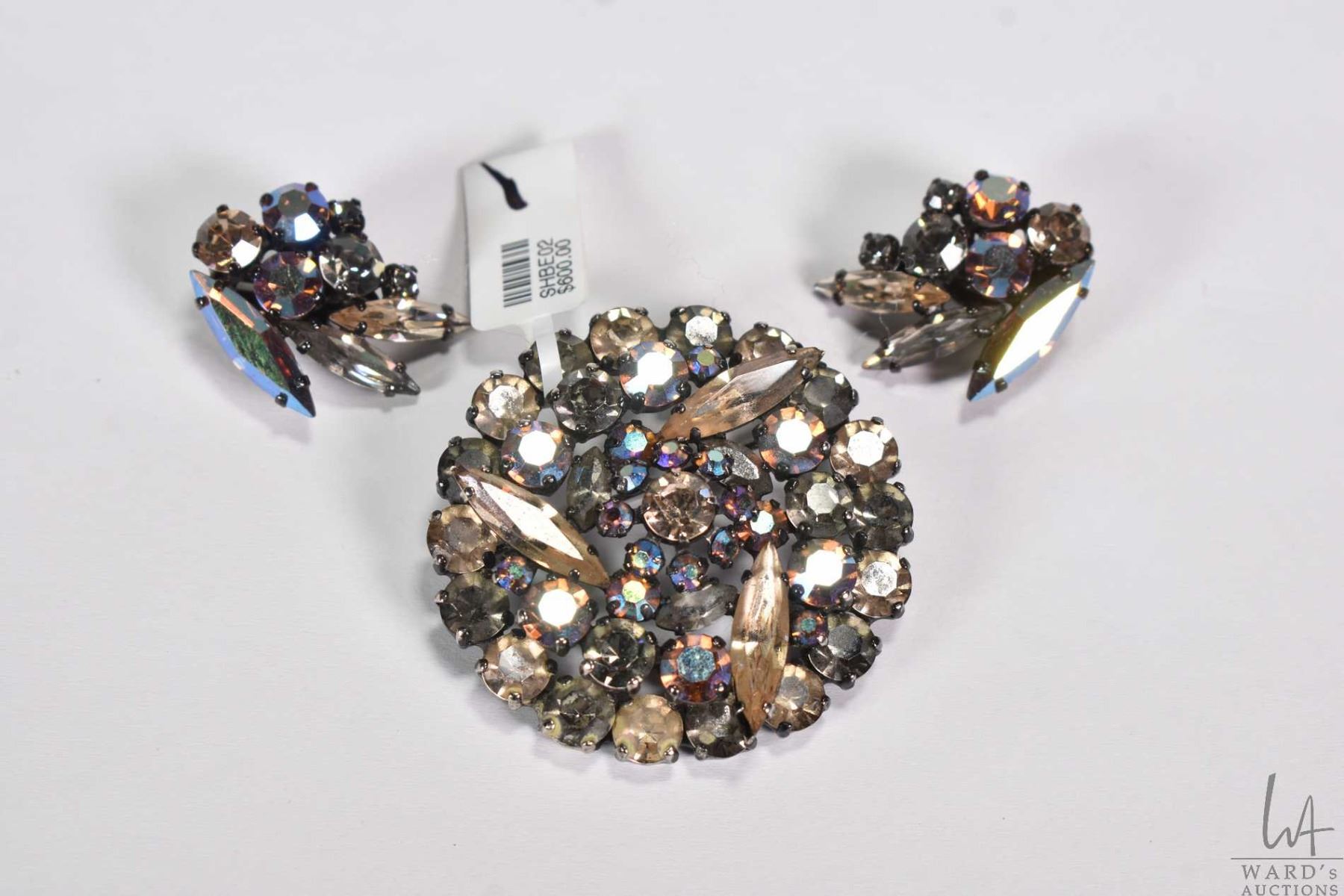 Vintage signed Sherman champagne and grey aurora borealis round brooch and matching earrings