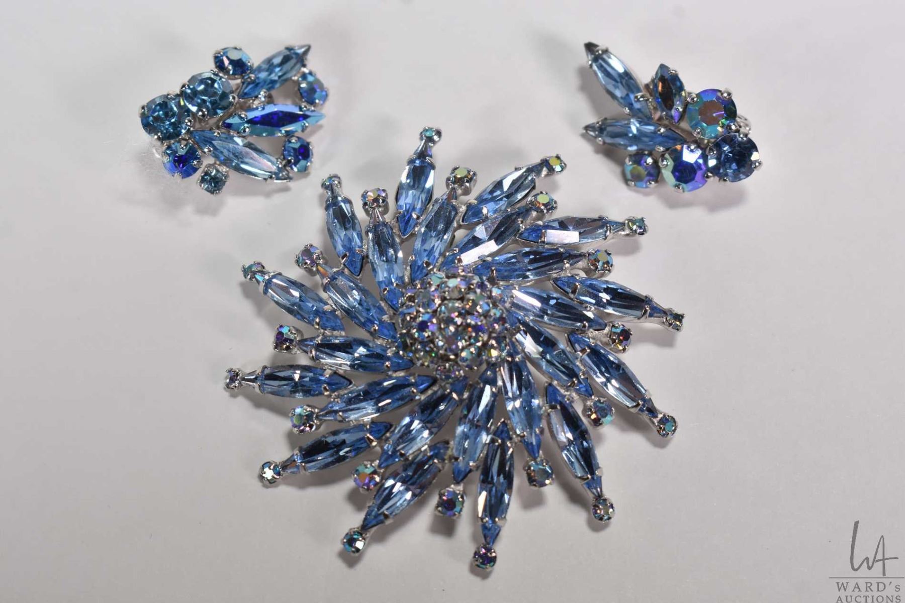 Vintage signed Sherman ice blue pinwheel like brooch and matching earrings