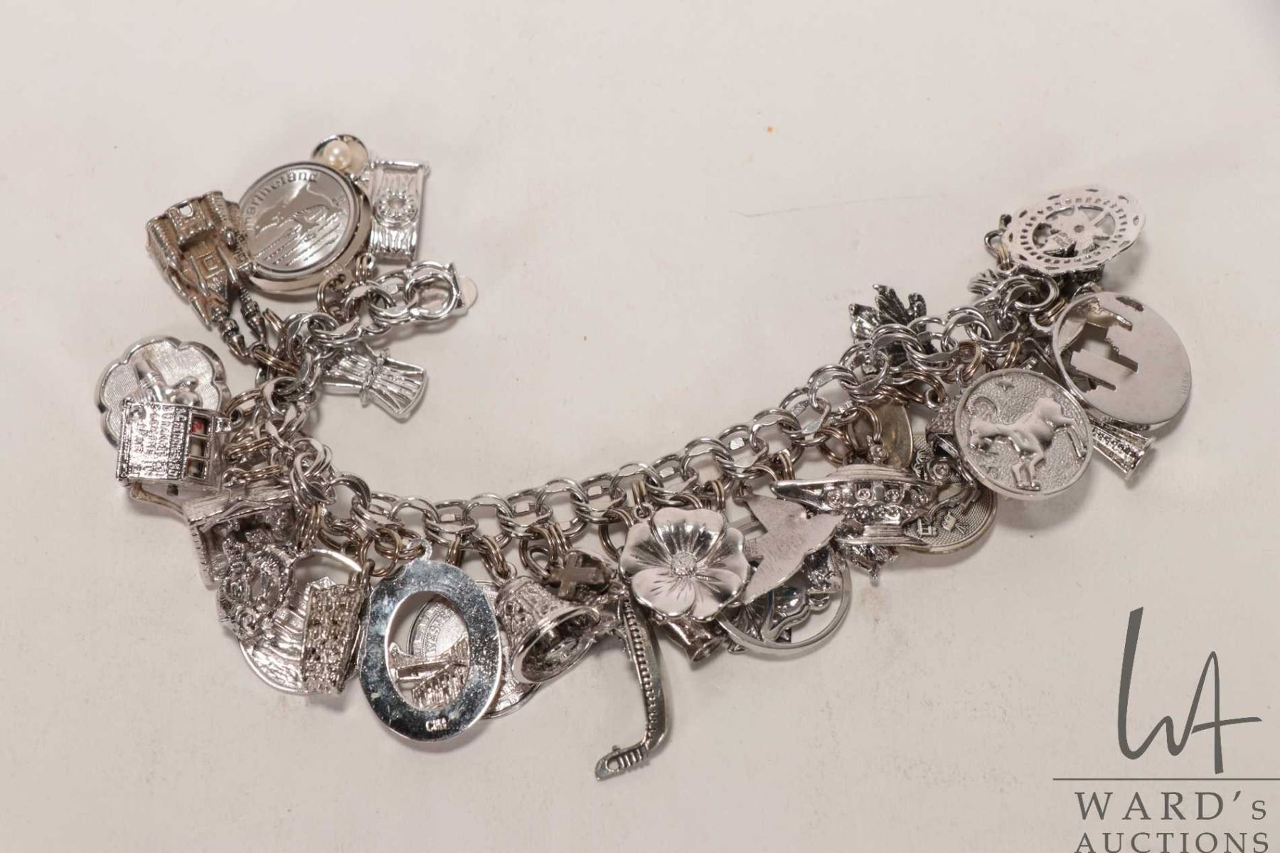 Vintage silver charm bracelet with approximately 30 sterling/ silver charms