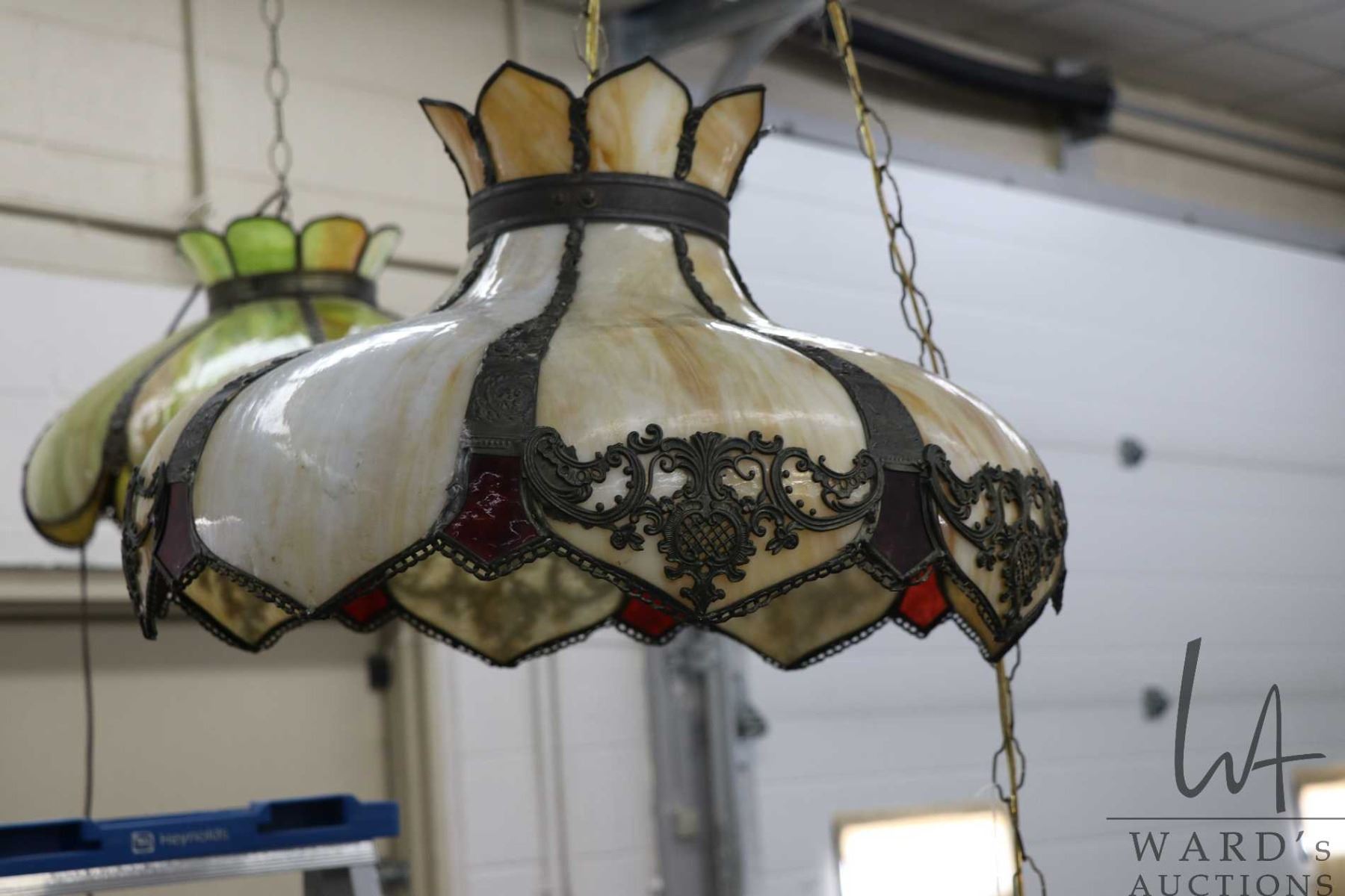 Vintage slag glass ceiling fixture with mottled brown slag glass and ormolu decoration, note: some distressing and some ormolu in small bag 22" in diameter. Note: Not available for shipping. Local pickup only