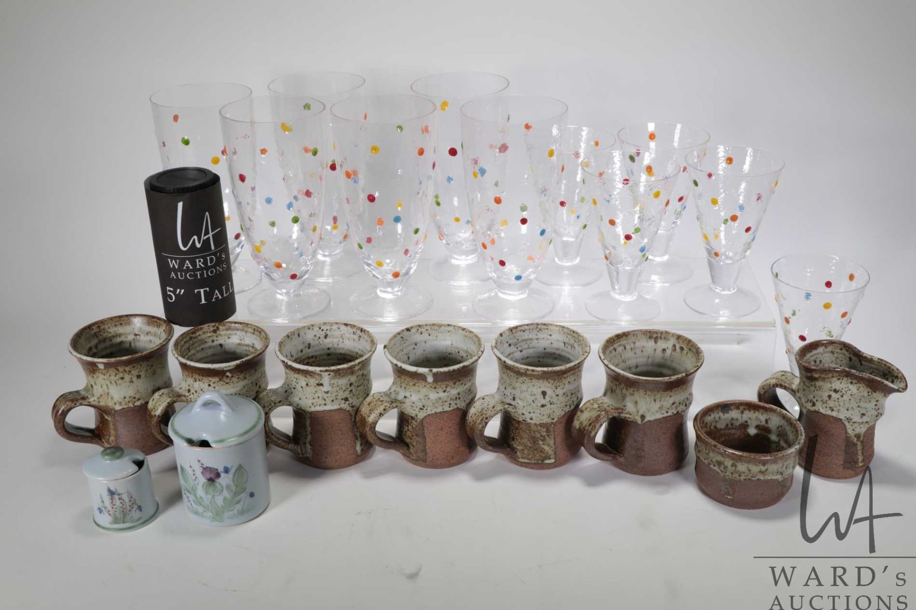 Vintage studio made coffee set including six cups, cream and sugar, two Portobello Scotland Buchan Finest stoneware spooners and eleven pieces of decorative glass spotted glasses. Note: Not available for shipping. Local pickup only