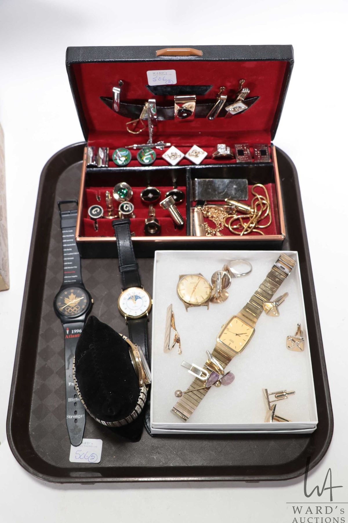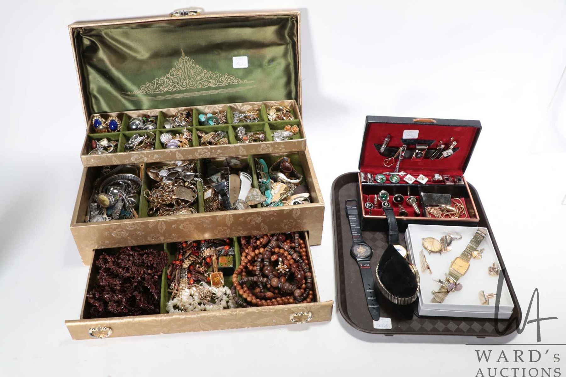 Vintage three tier jewellery box including necklaces, rings, bracelets, neck chains, brooches etc. plus a selection of gents jewellery including cufflinks, tie clips, workings Buren Shock Protector, working at time of cataloguing and a Seiko 17 jewel Automatic, not working at time of cataloguing