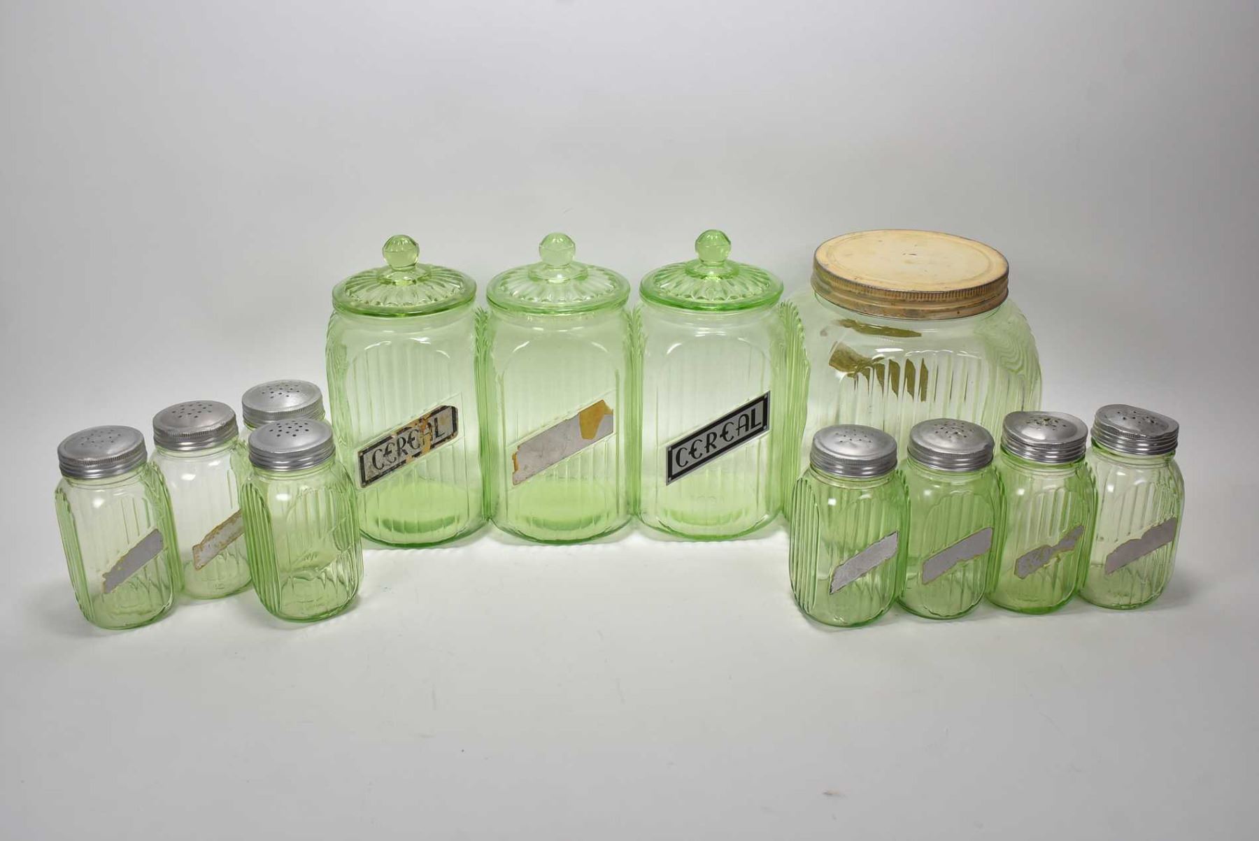 Vintage twelve piece Uranium glass canister set including three lidded "Cereal" canisters, eight spice jars with shaker tops and a cookie jar
