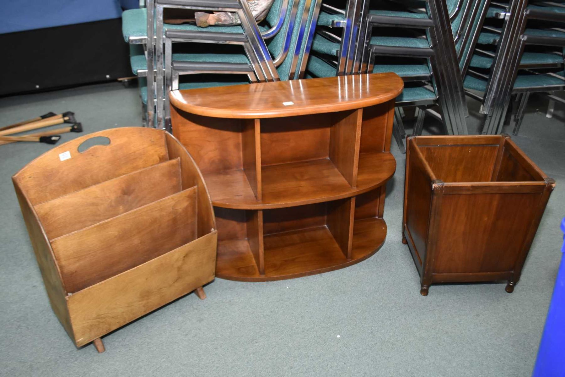 Vintage walnut office garbage can, small flat to the wall shelf and a vintage magazine holder