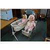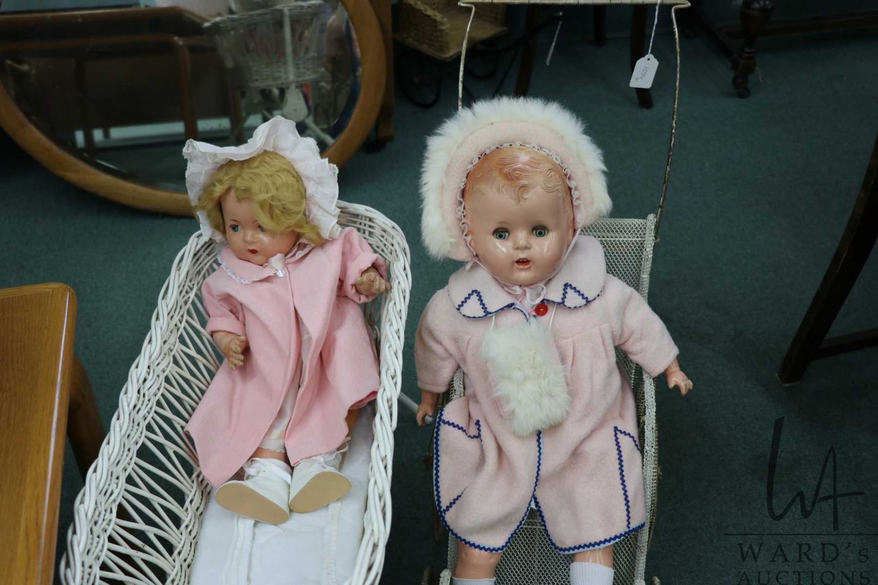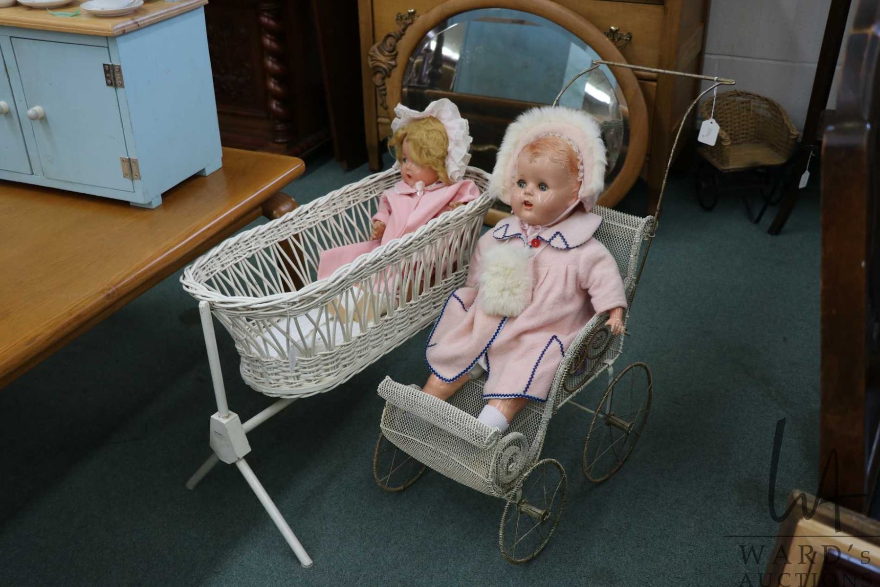 Vintage wicker cradle and a woven wire baby stroller plus two vintage composition dolls