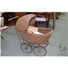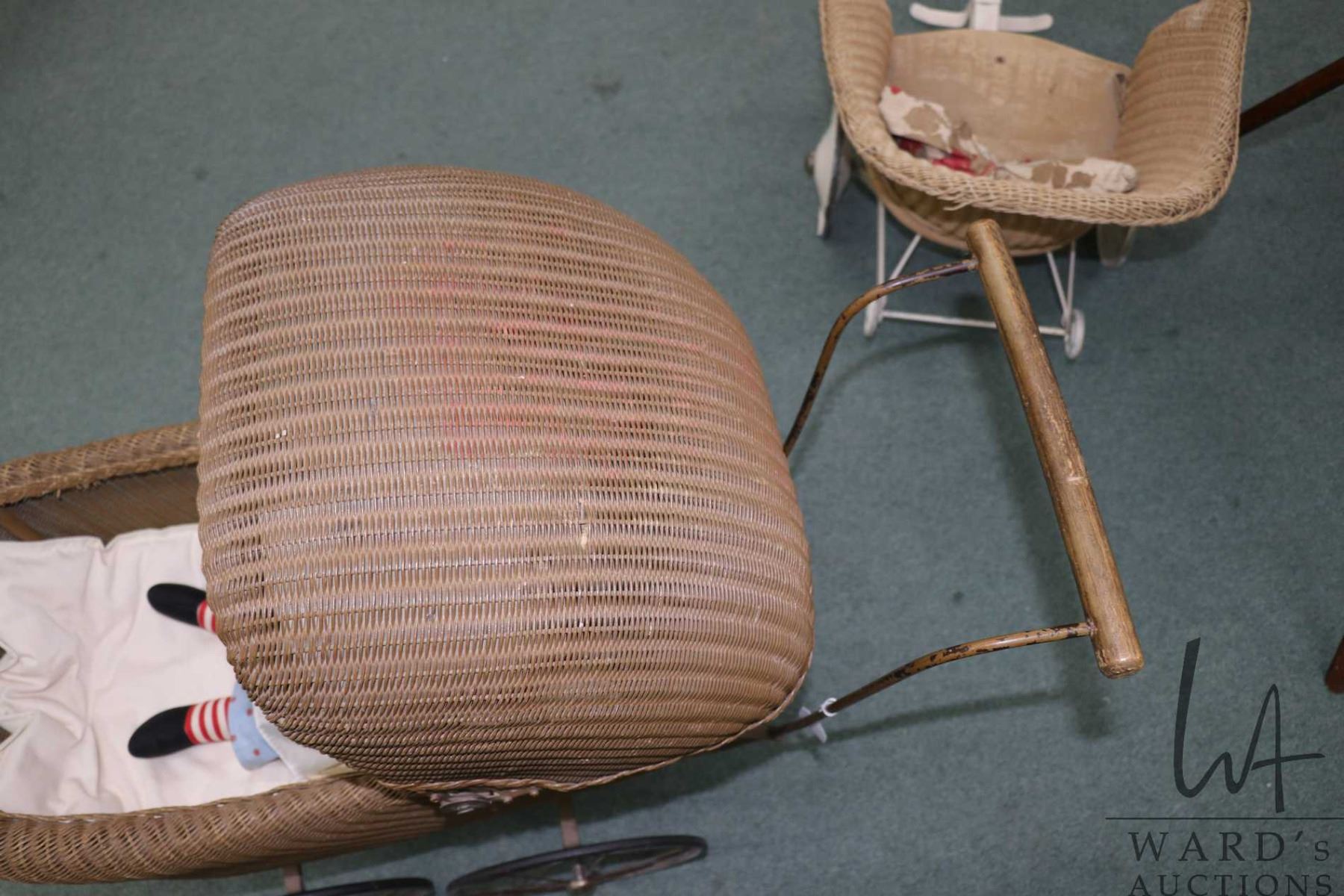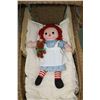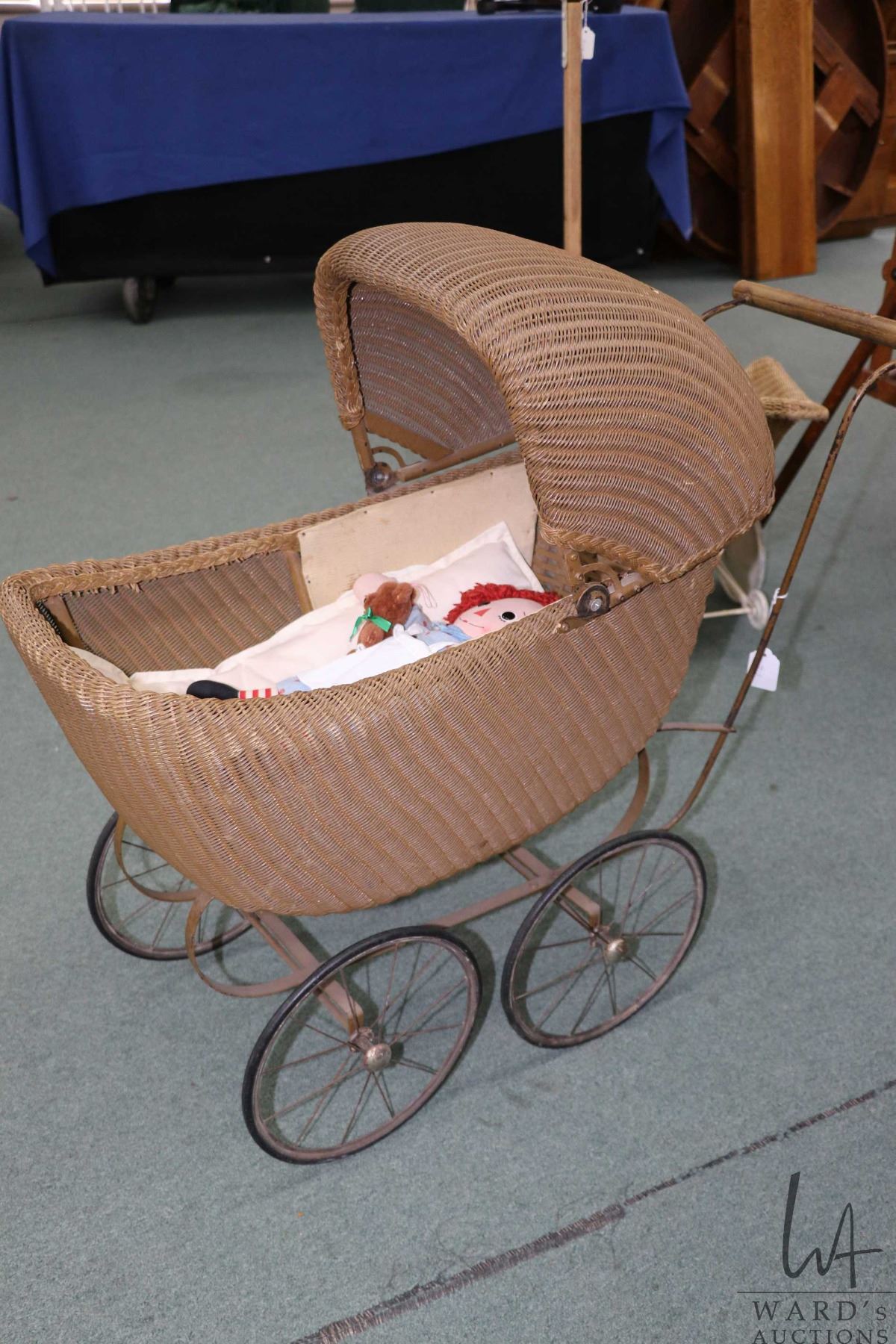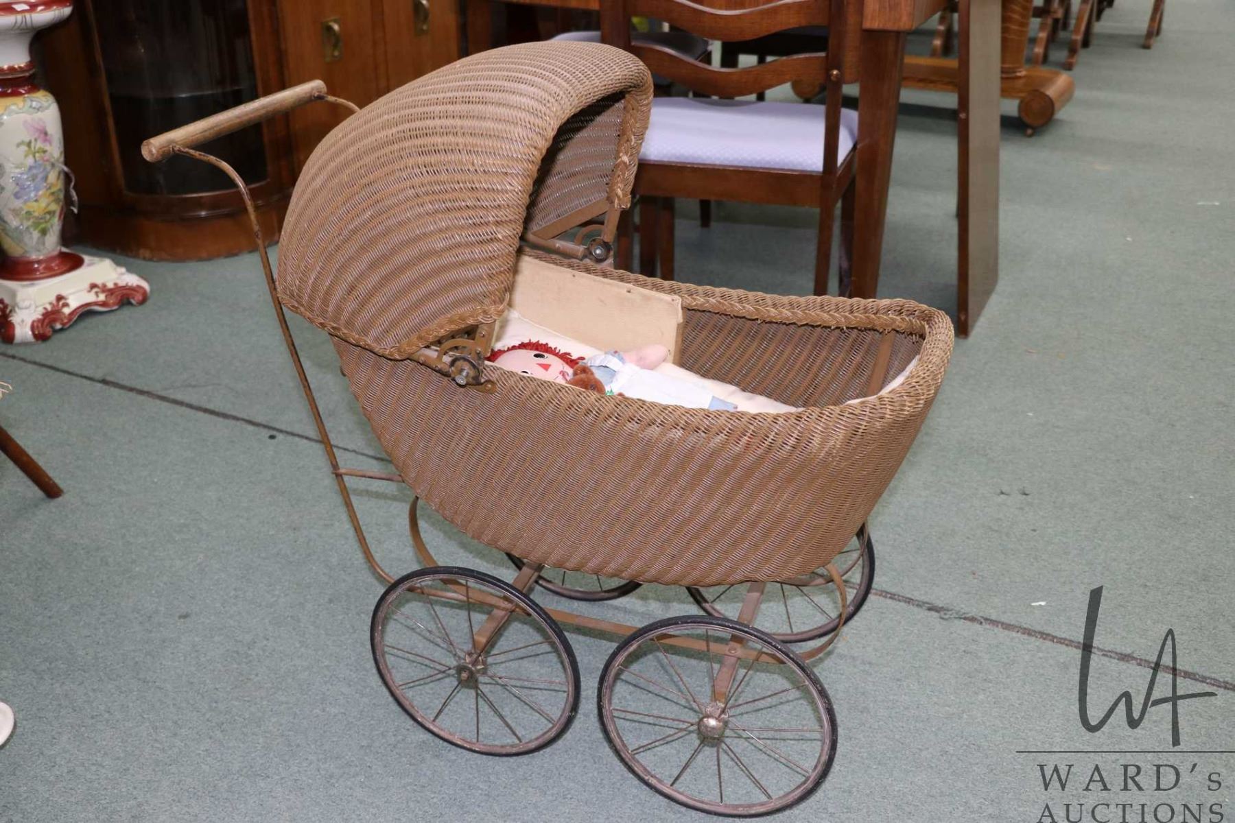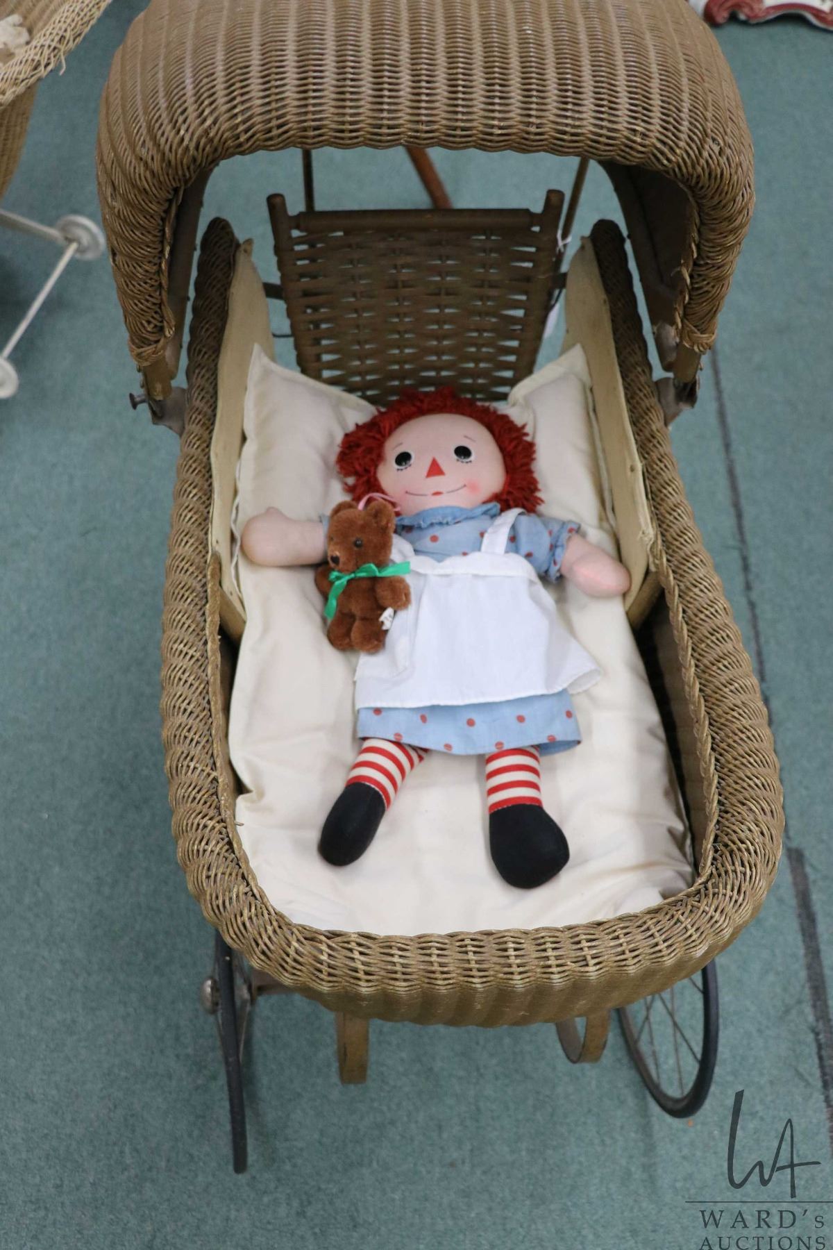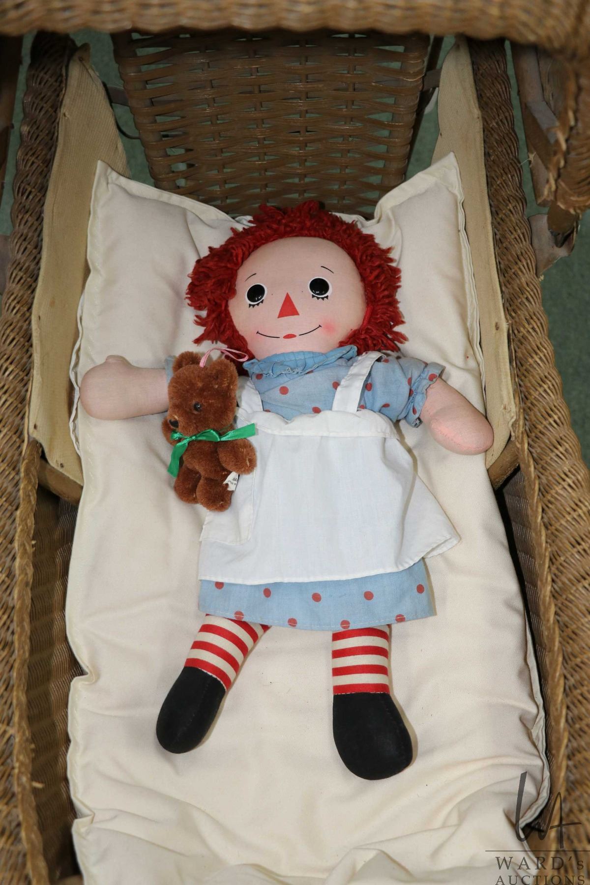 Vintage wicker dolls pram with vintage Raggedy Ann doll. Pram 31" to top of bonnet