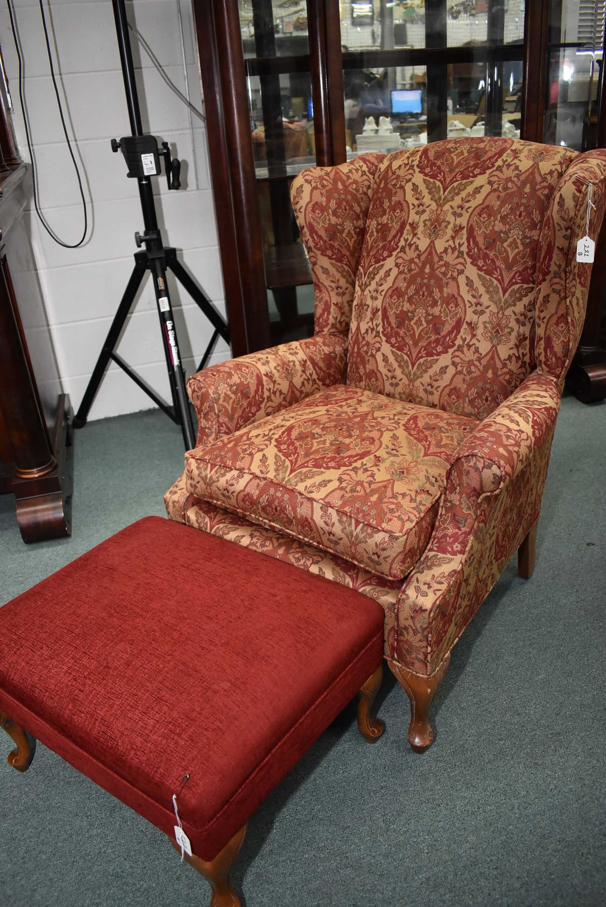 Vintage wing back chair with cabriole feet and small upholstered foot stool