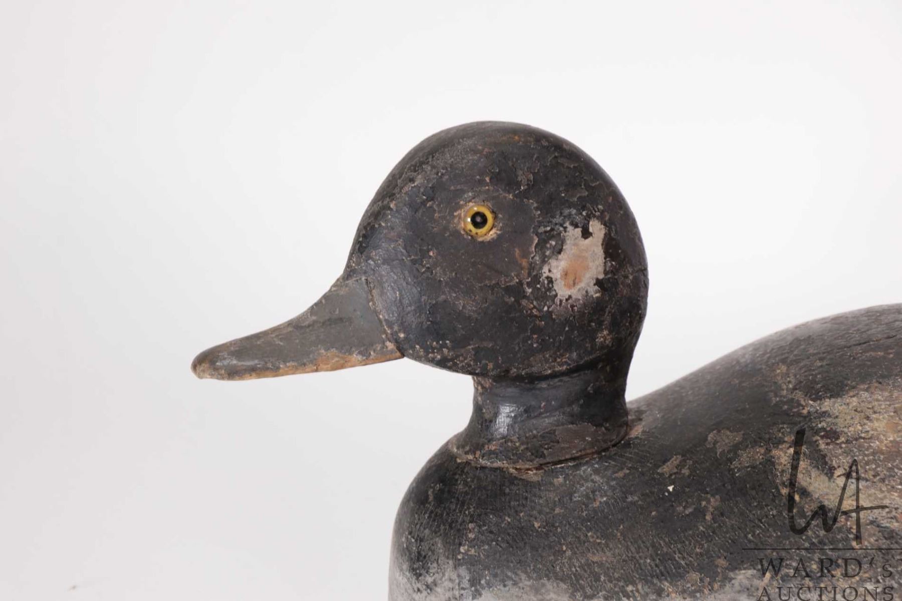 Vintage wood duck decoy with 12" base, 6" height, artist initialed "W. D." and tagged "Odessa, ON Golden Eye" underneath