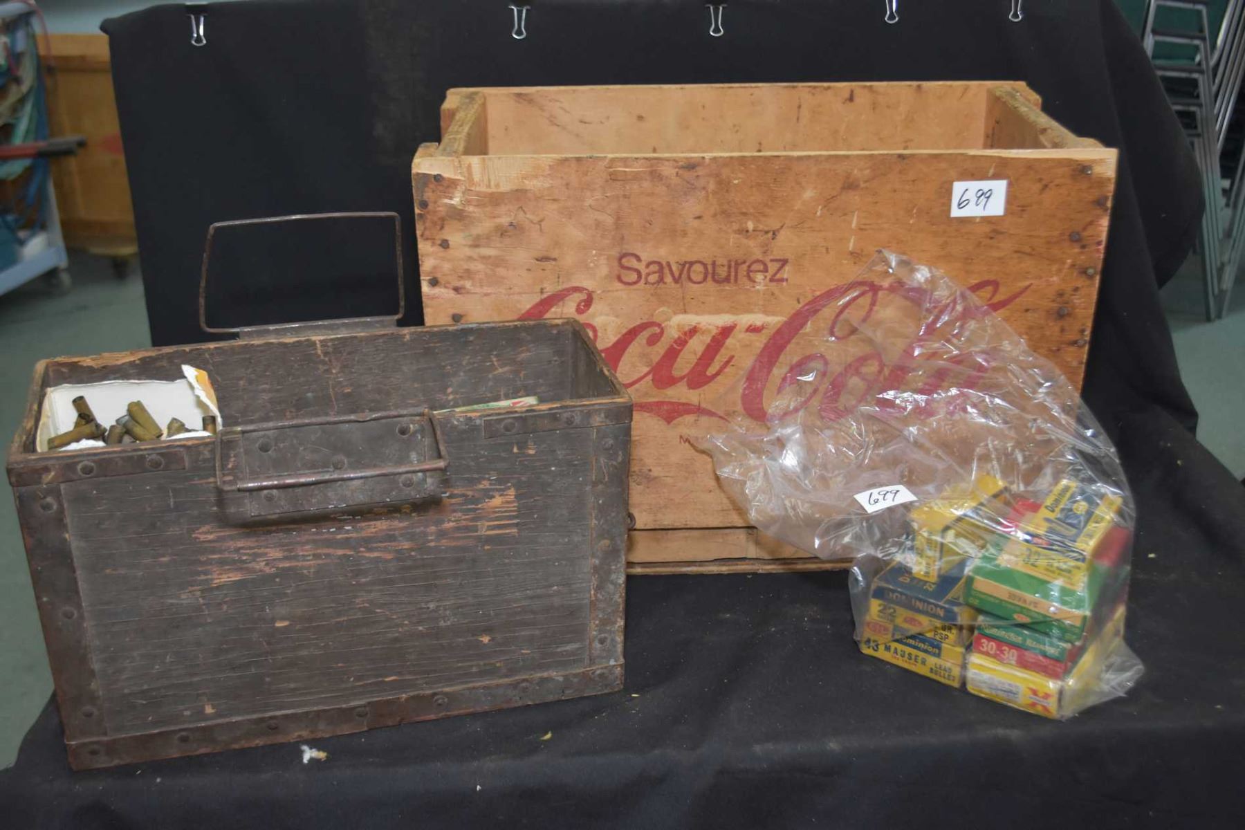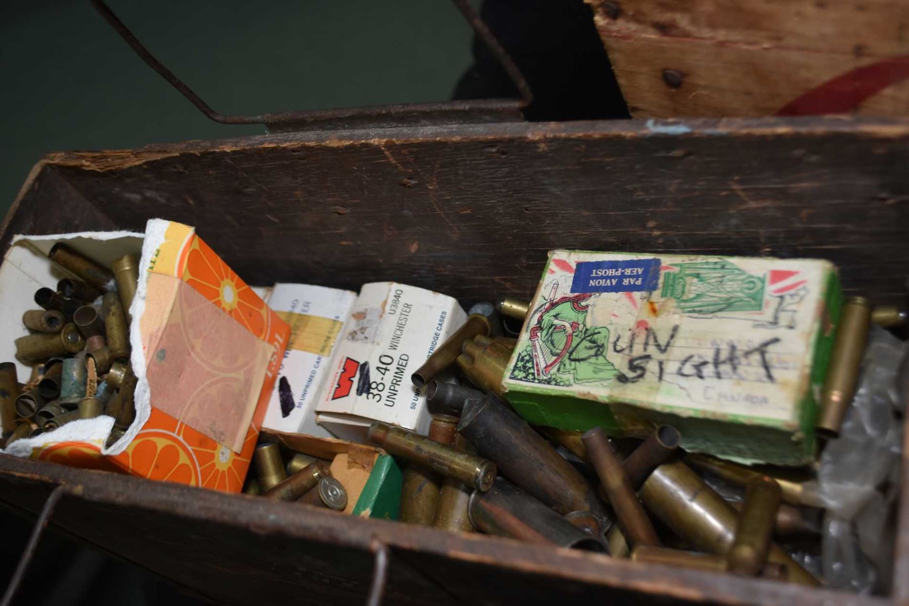 Vintage wooden Coca-cola box containing bullet components including brass, shot and bullets (no powder and primers) plus another wooden munitions box