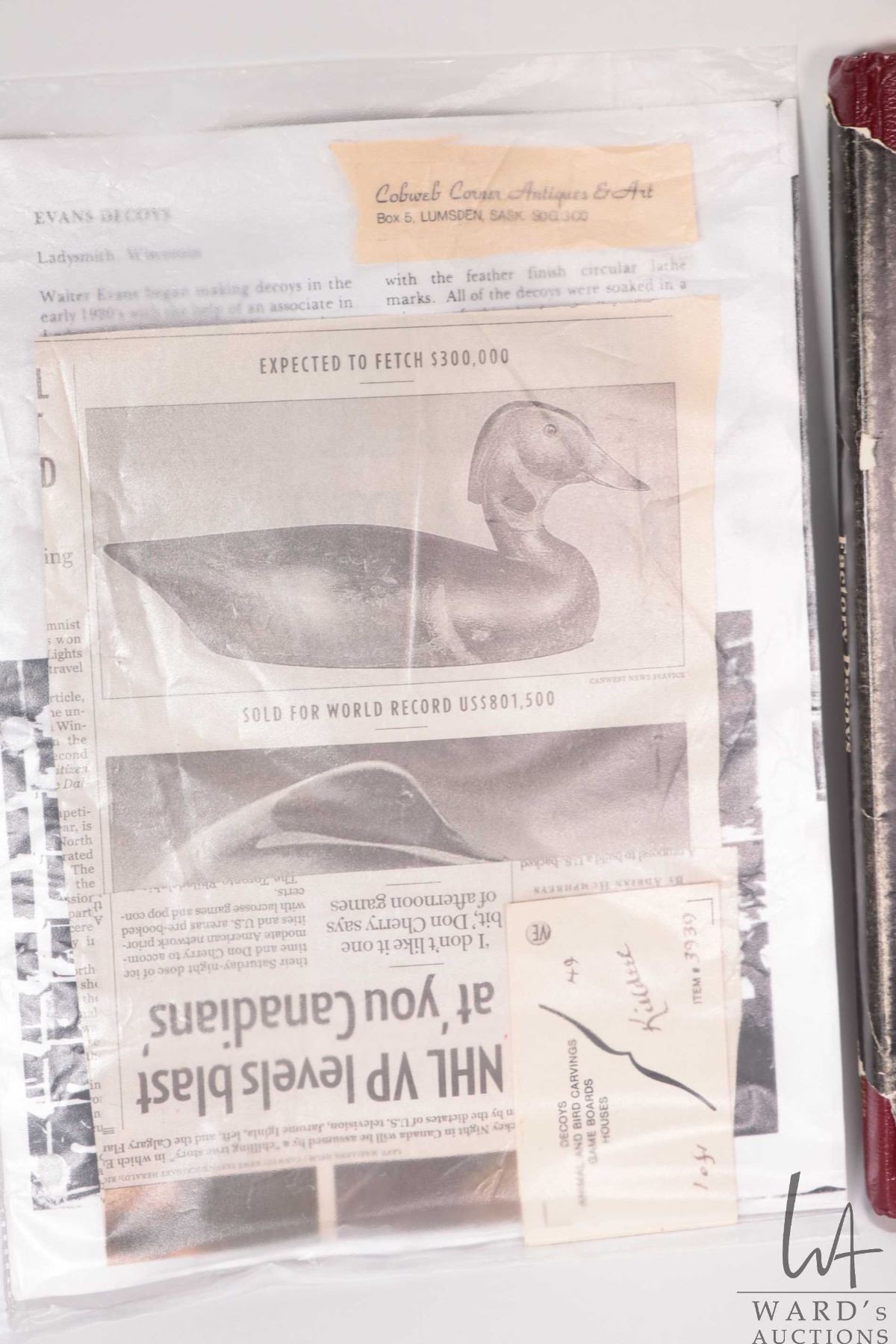 Vintage wooden duck decoy with 14" long base, 6" in height, artist initialed R.B. underneath and assorted ephemera and hardcover book "Factory Decoys"