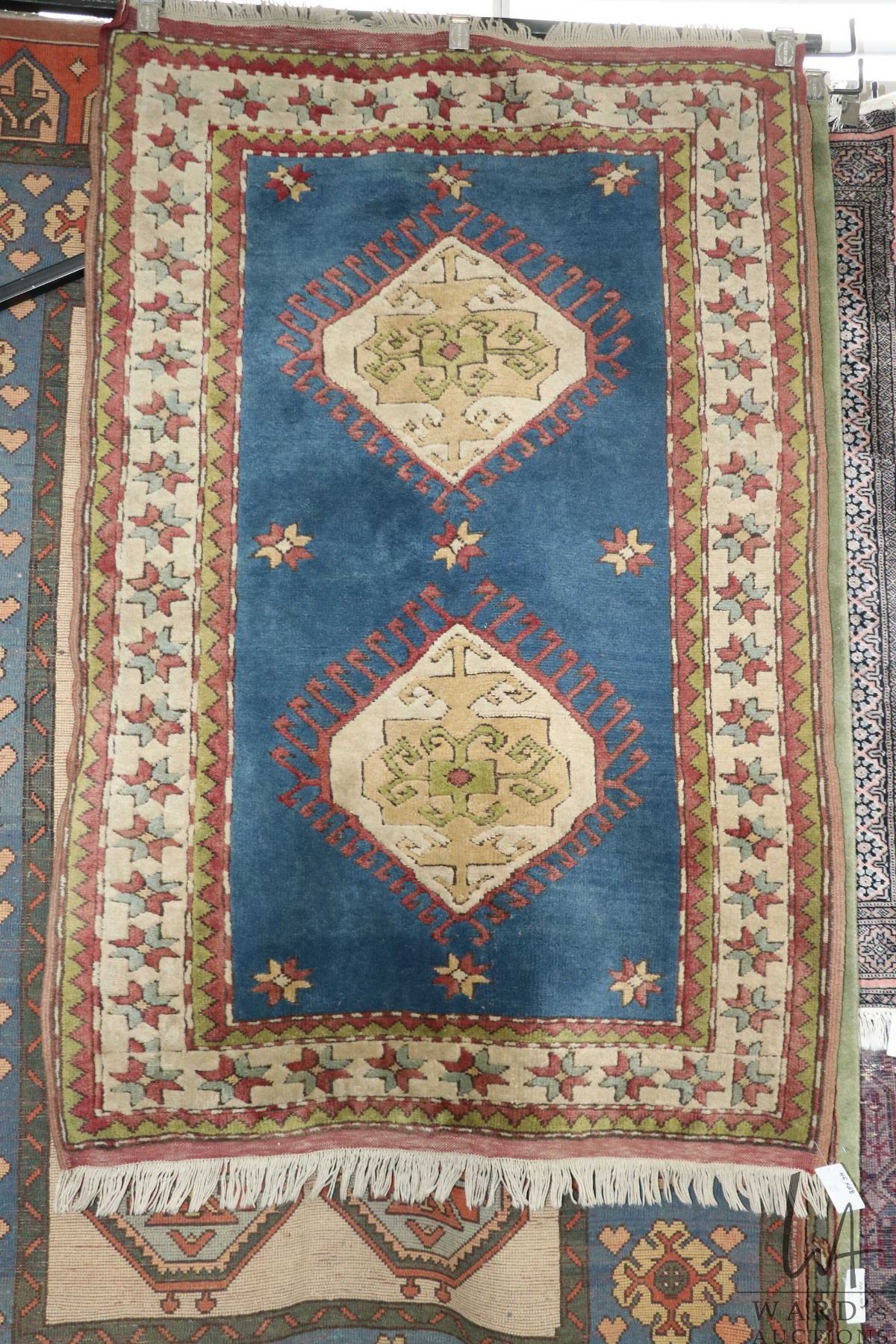 Vintage wool area rug with double medallion, blue background and highlights of sage, cream and red 45" X 68"