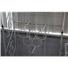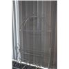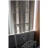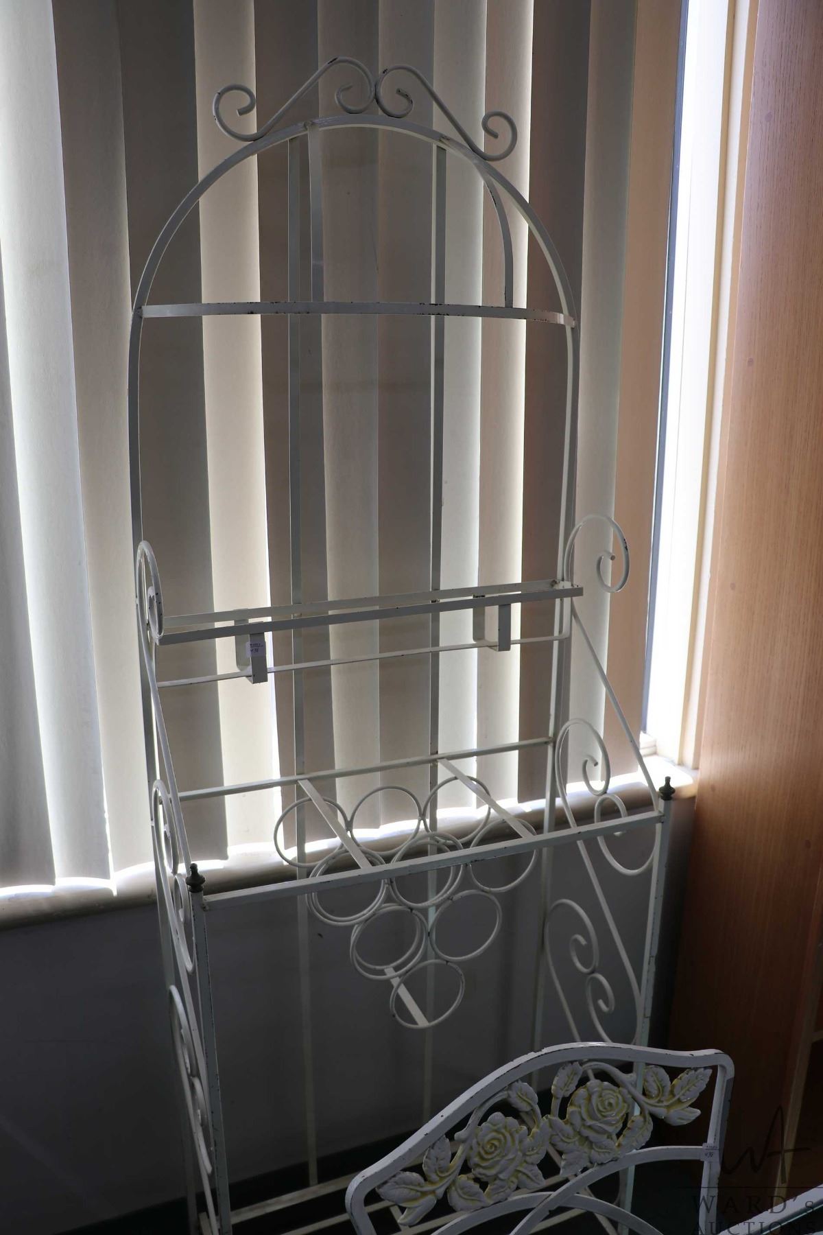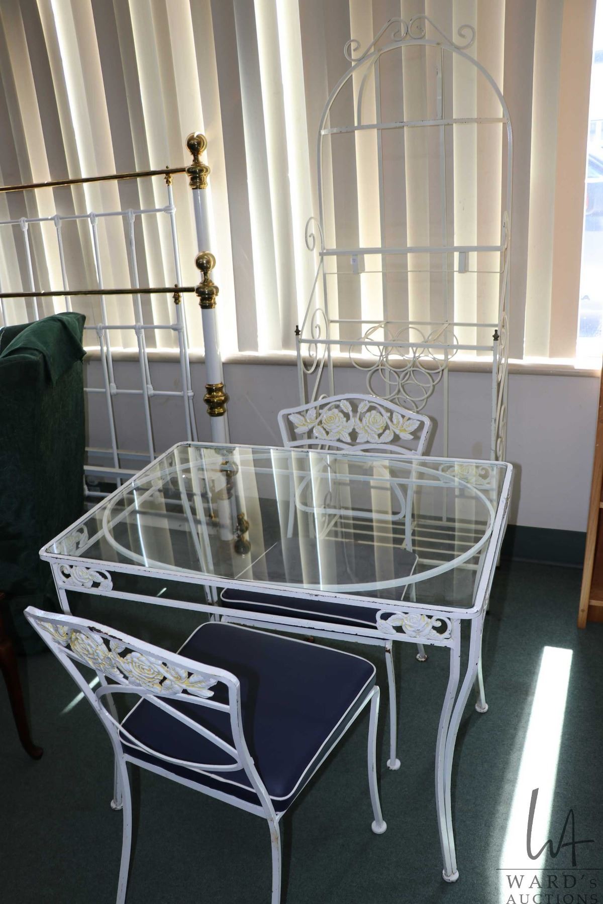 Vintage wrought iron and glass top patio table with two matching chairs, 29" H X 35" X 25" plus a white metal bakers rack with wine storage 74" H X 24" W X 12" D