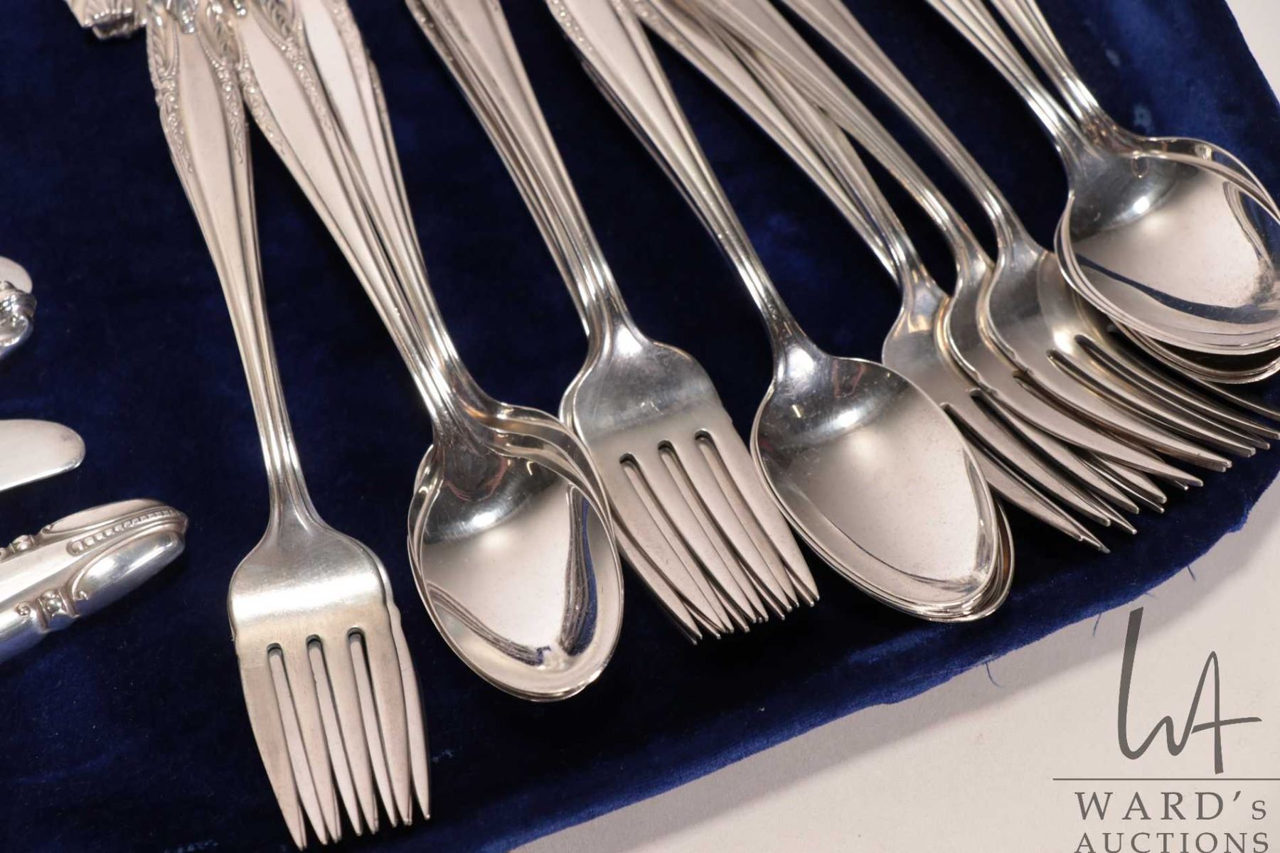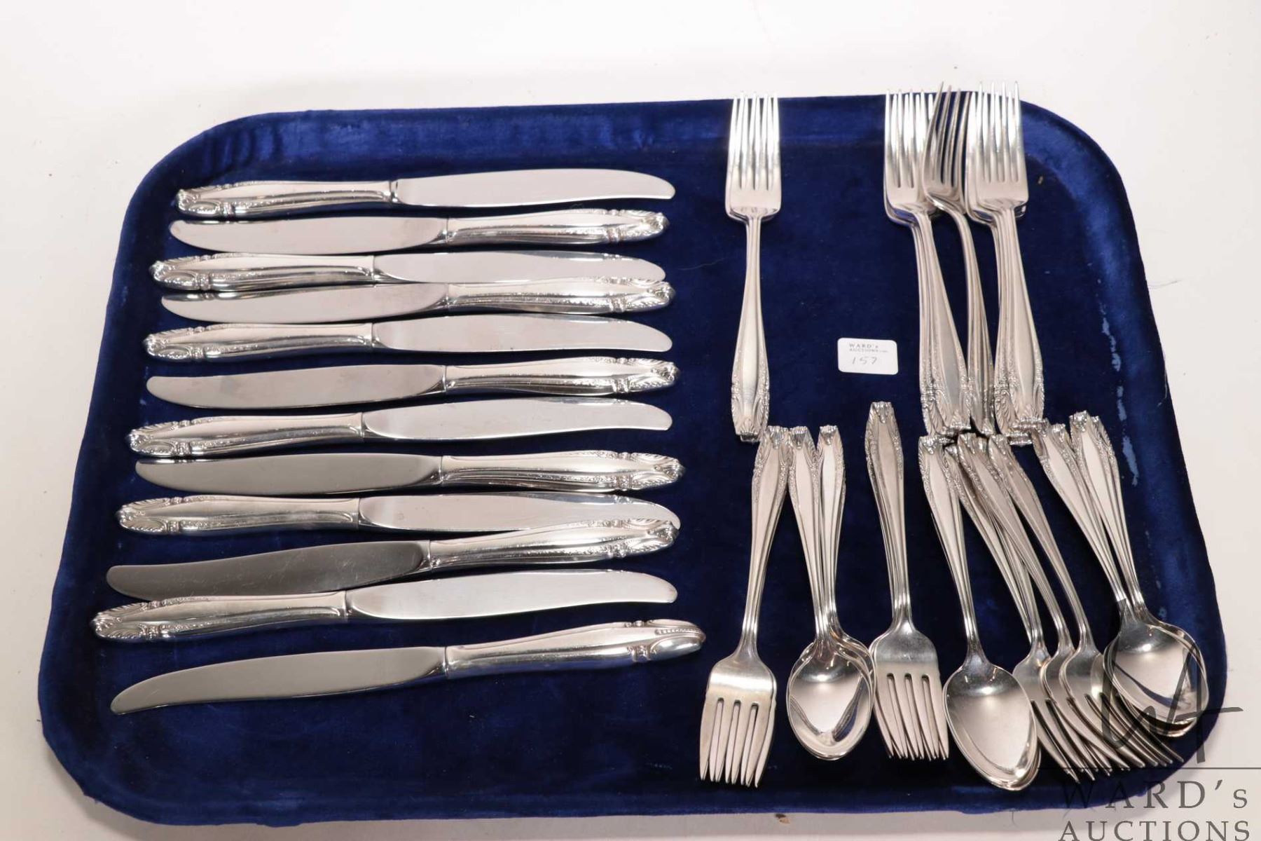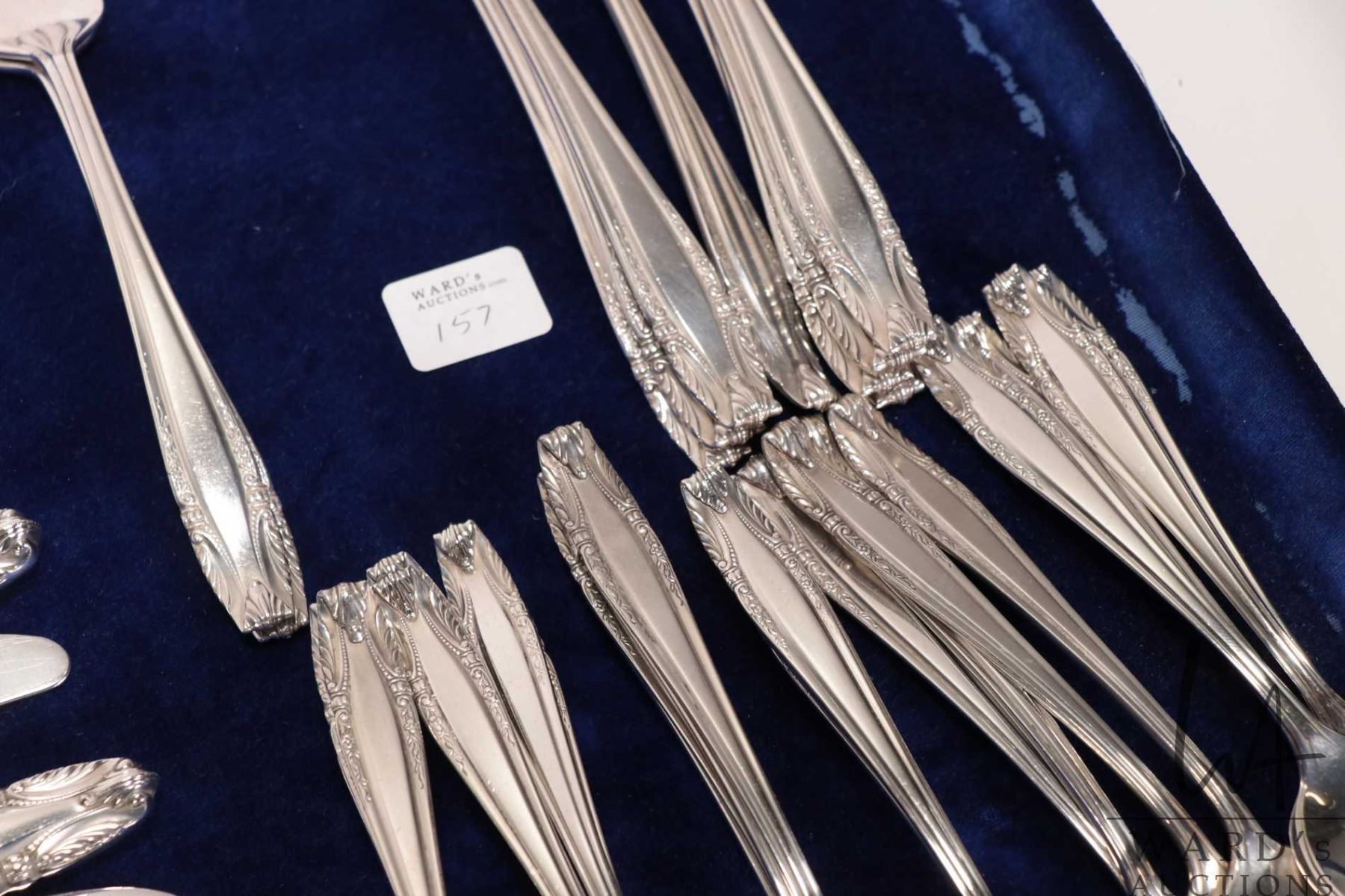 Wallace "Stradivari" sterling silver flatware including settings for twelve of luncheon knives and dessert spoons, plus ten luncheon forks and twelve dessert forks, to match lot 156