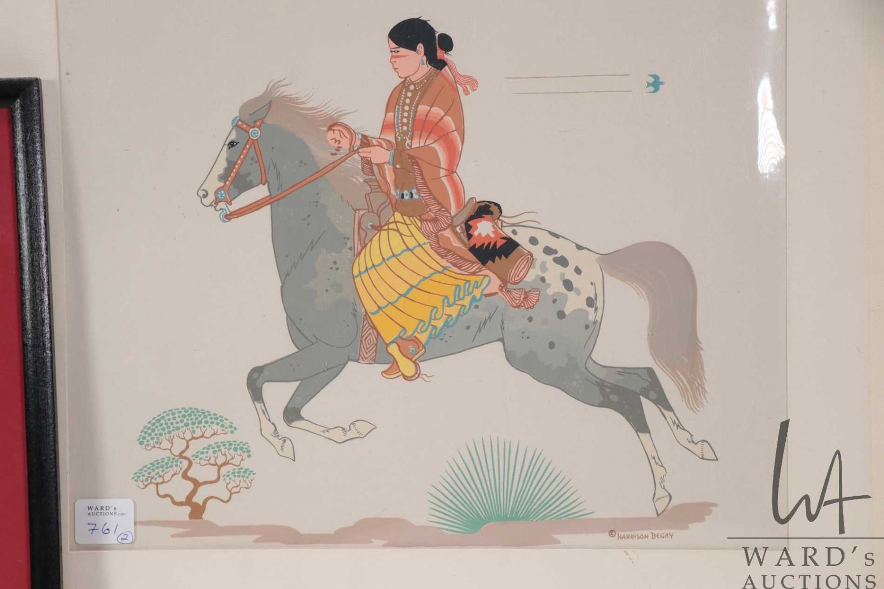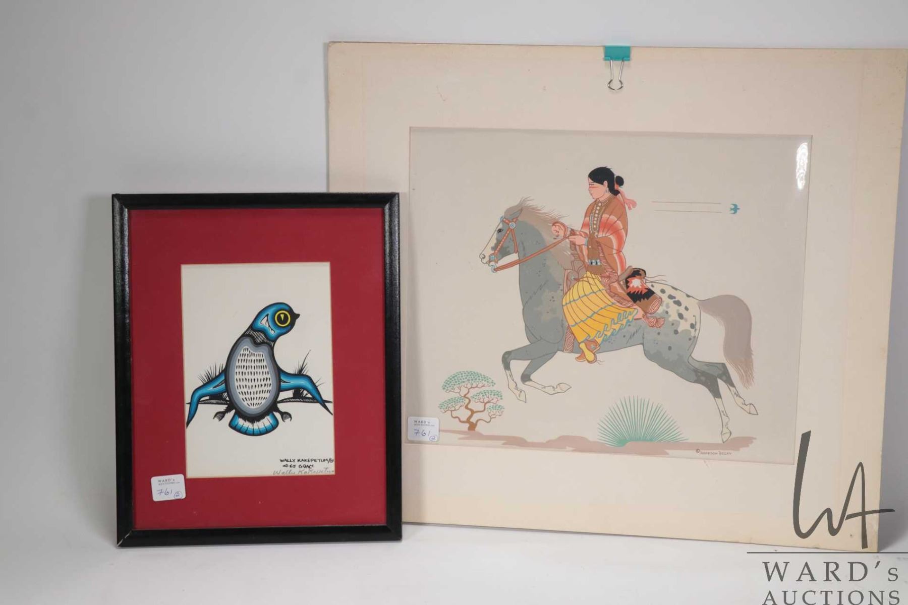 Wally Kakepetum, untitled bird 7 3/4" X 4 3/4" and Harrison Begay unframed serigraph of a Inuit rider 15" X 17" including matting