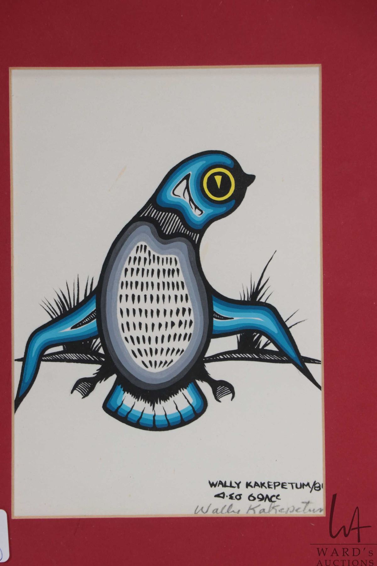 Wally Kakepetum, untitled bird 7 3/4" X 4 3/4" and Harrison Begay unframed serigraph of a Inuit ride