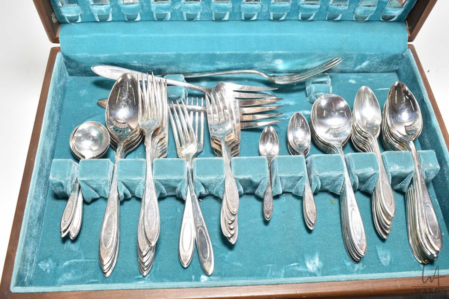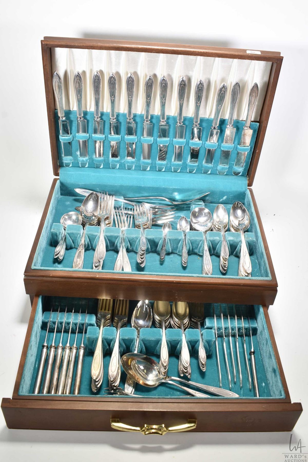 Walnut canteen of Community Plate flatware including twelve knives, ten each of tablespoons, dinner forks and dessert forks, twenty seven teaspoons, six soup spoons, four luncheon forks, five spreaders, four serving spoons, four serving forks, five small ladles, and three pickle tridents etc.