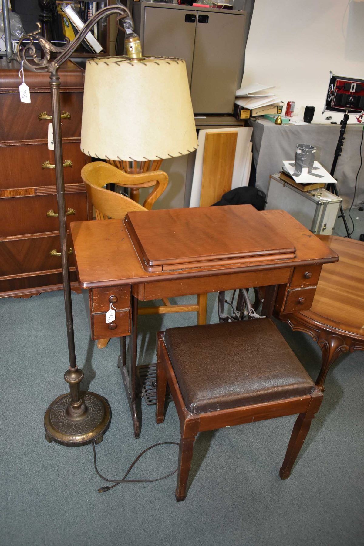 Walnut cased Singer sewing machine with stool and a bridge lamp with cast top