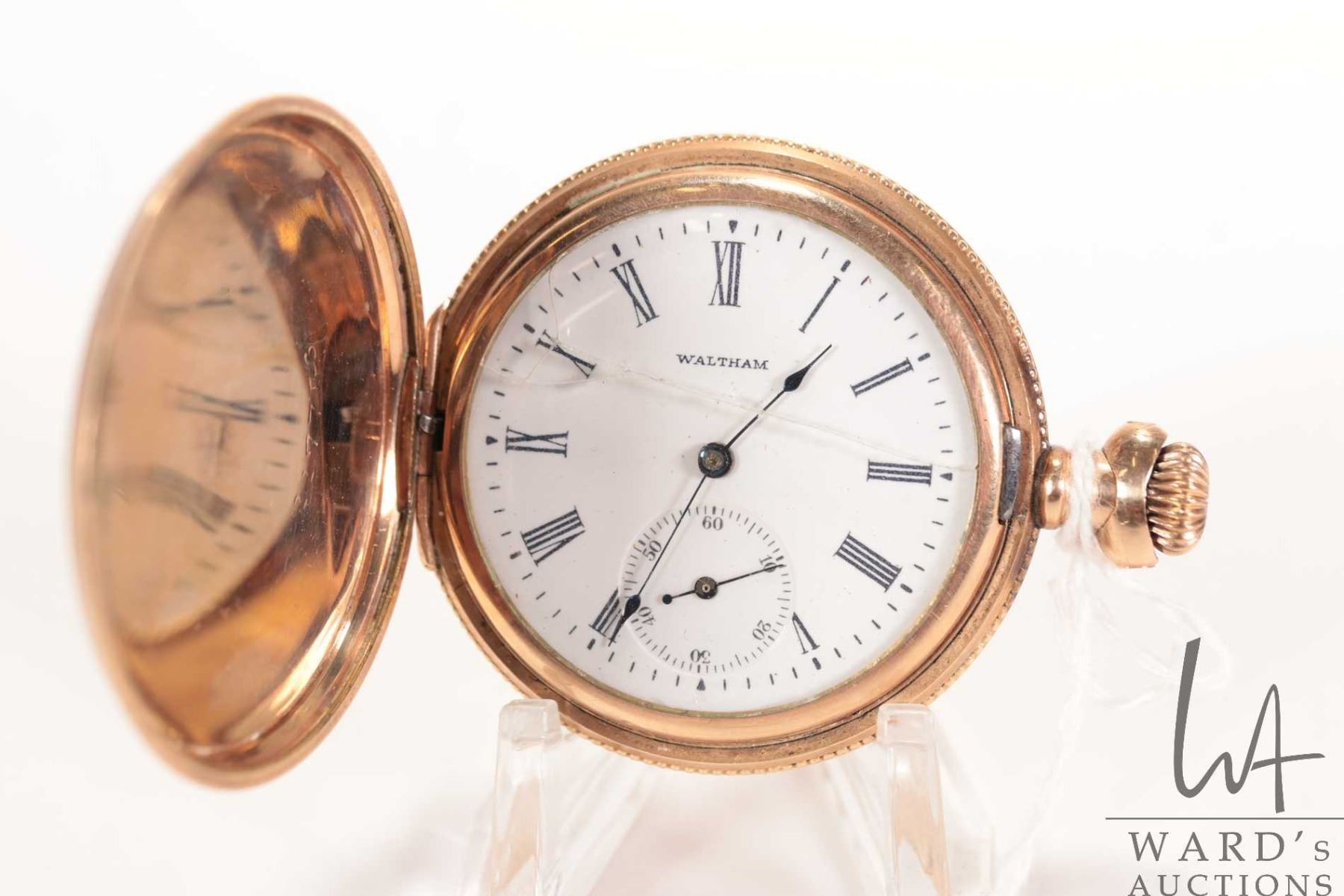 Waltham 7 jewel pocket watch model 1890 with white enamel double sunk dial, gold filled full hunter case roman numerals and Arabic second sweep, size 6s. Manufactured approximately 1899, serial number 9161635. Gold filled case. Note, missing chain loop, and crystal is broken. Working at time of cataloguing
