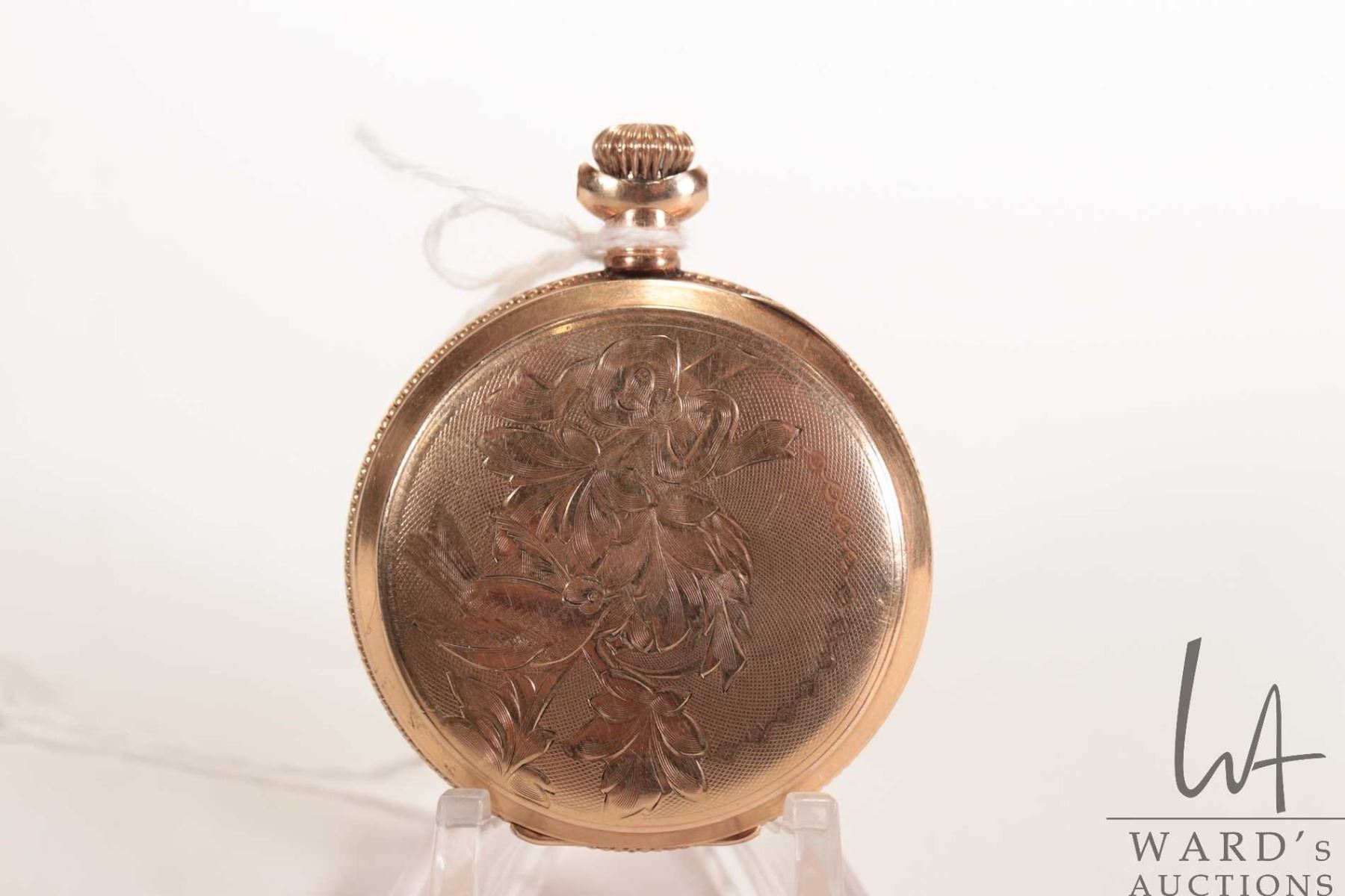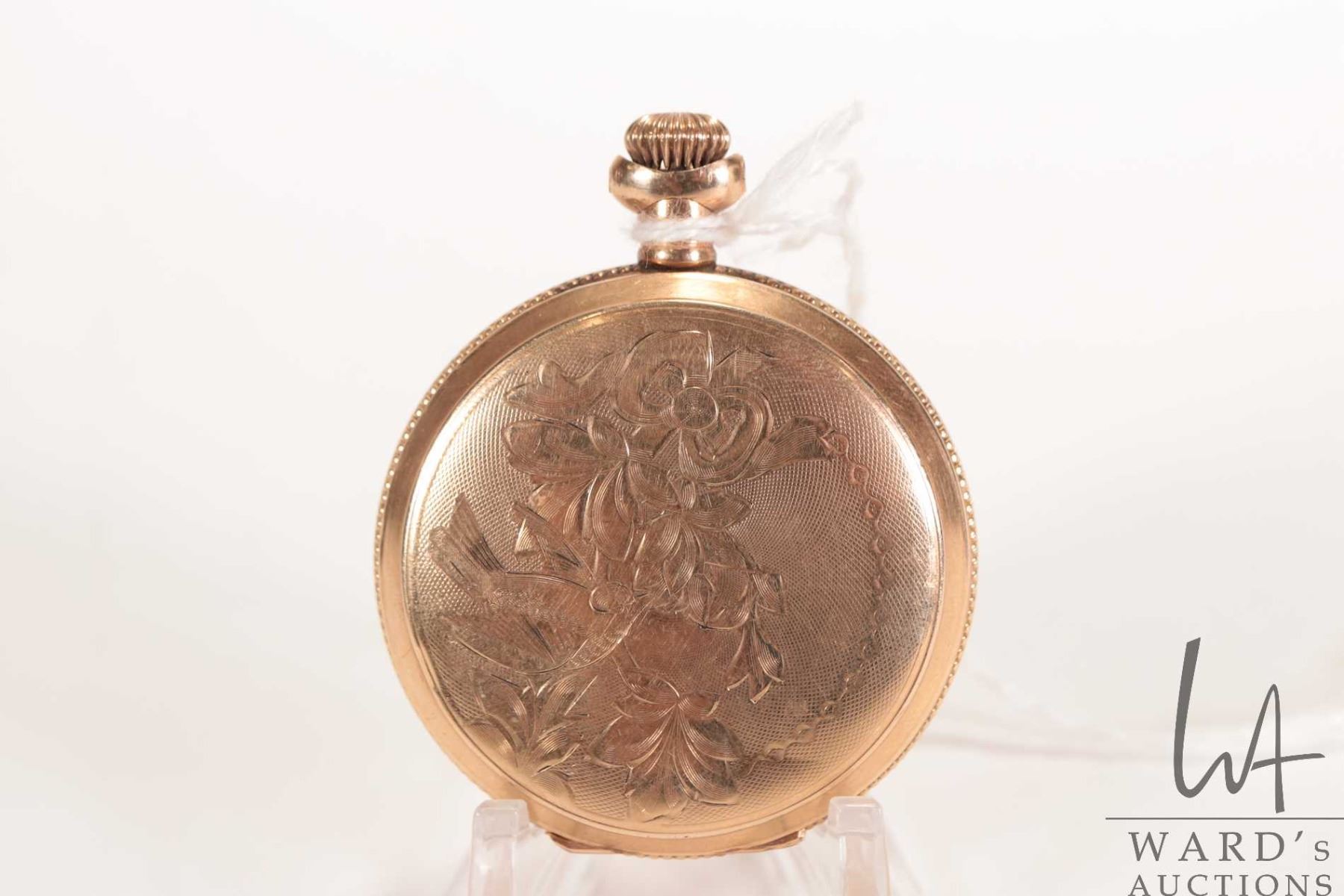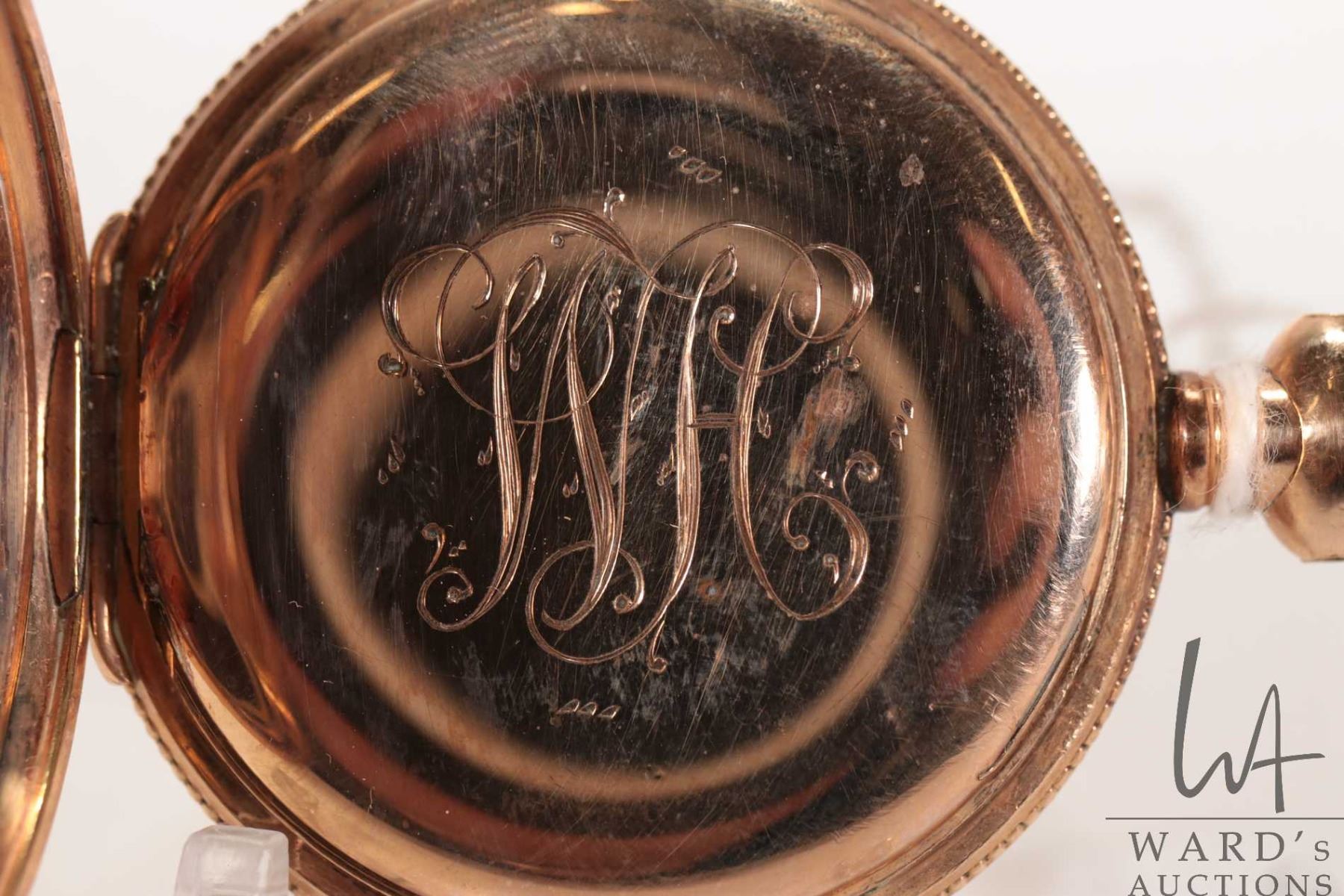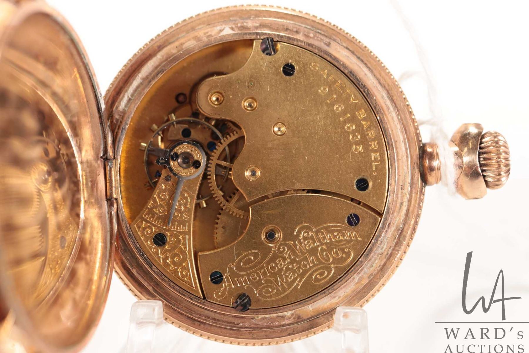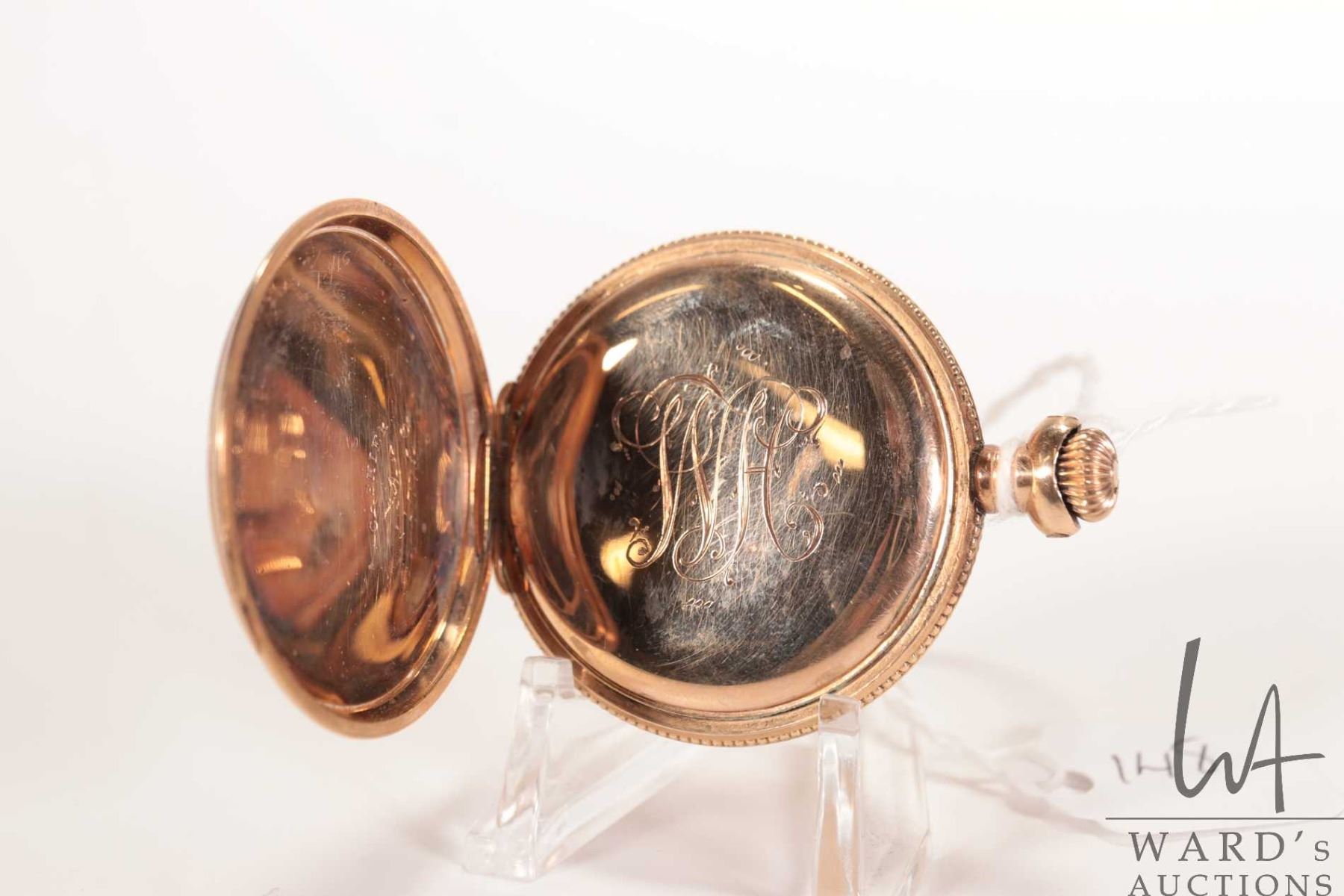 Waltham 7 jewel pocket watch model 1890 with white enamel double sunk dial, gold filled full hunter