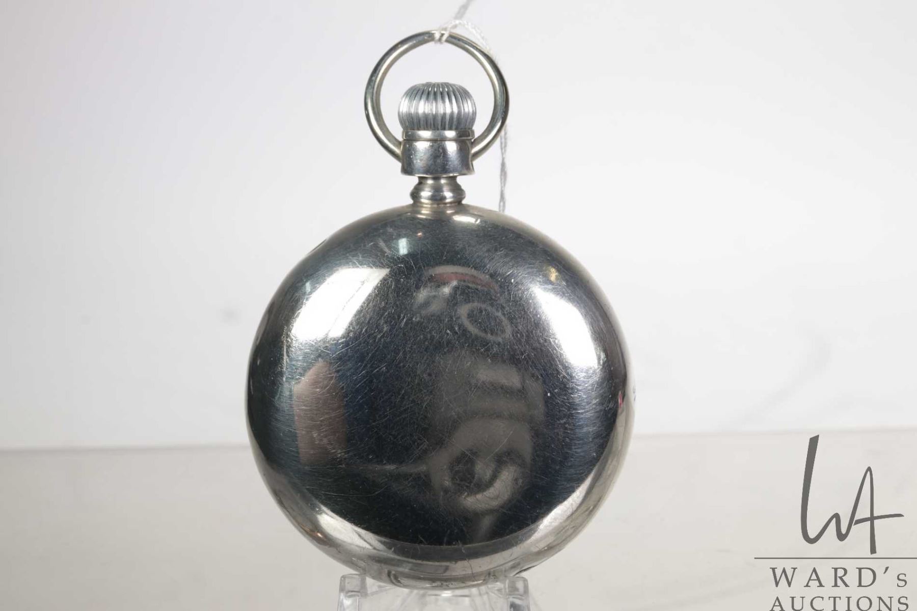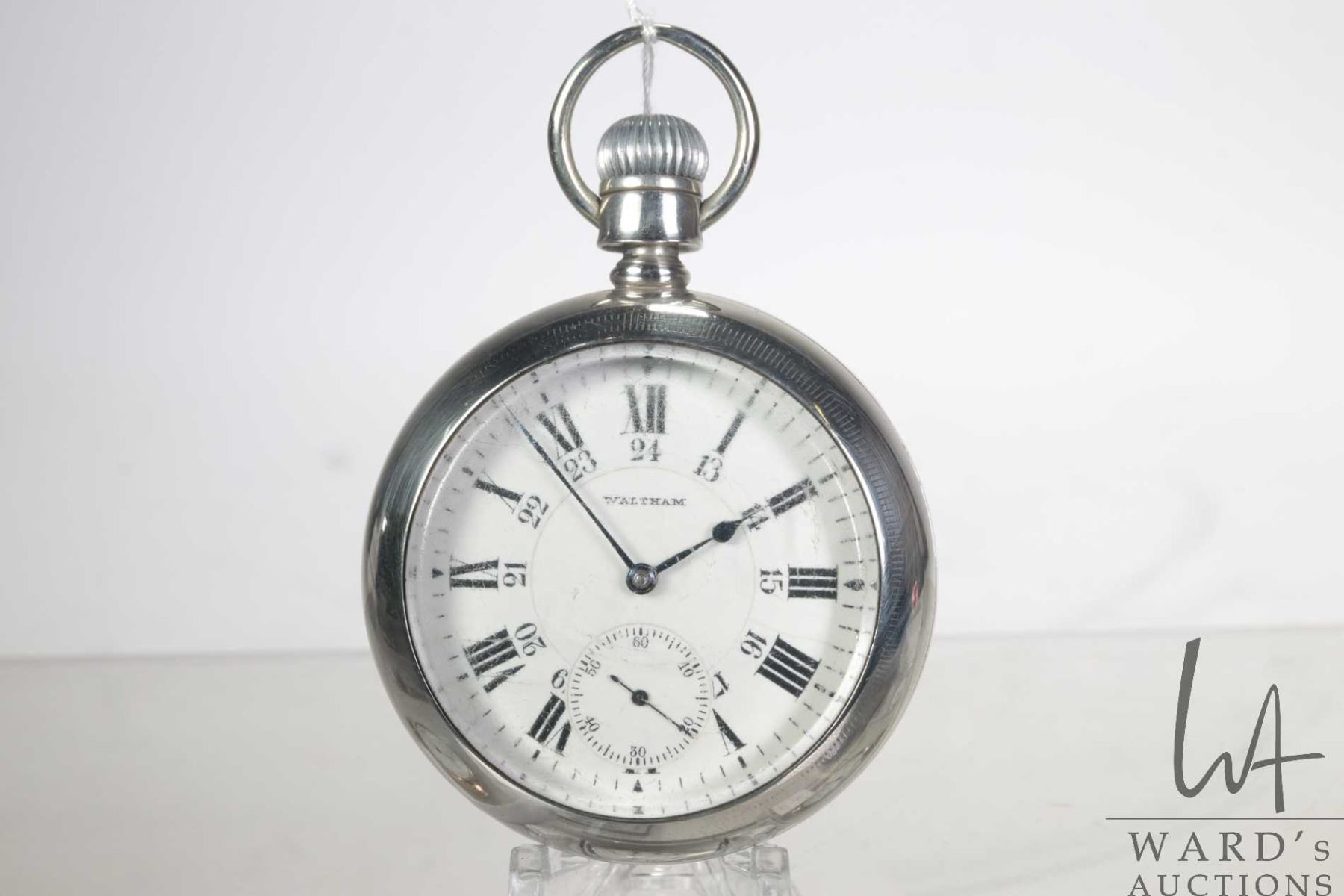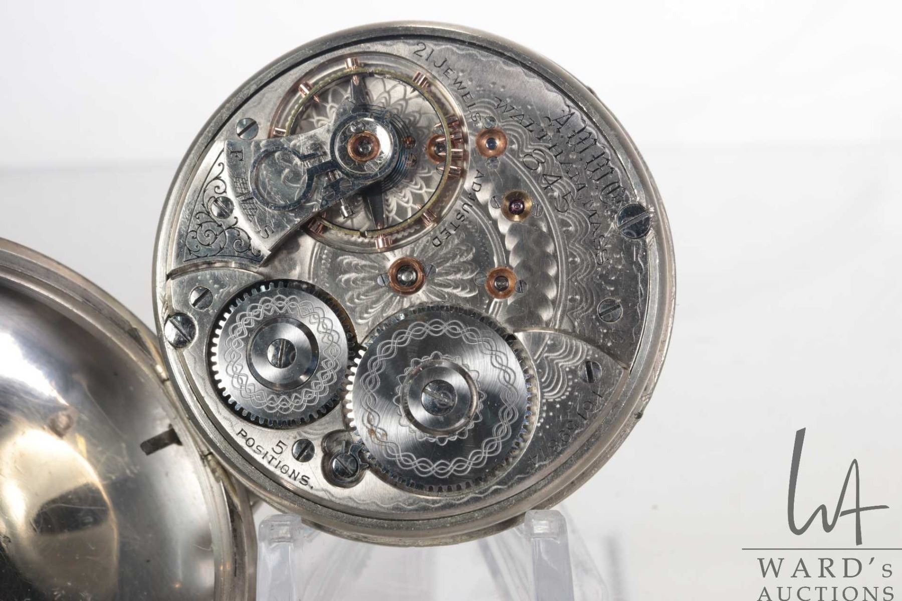 Waltham Grade 845, model 1892, 21 jewel pocket watch with double sunk second sweep on white porcelain dial and Roman numerals. Engraved full plate. Sterling silver A.W.C. Co. open face case. Sized 18, serial number 16159874, circa 1907. Working at time of cataloguing