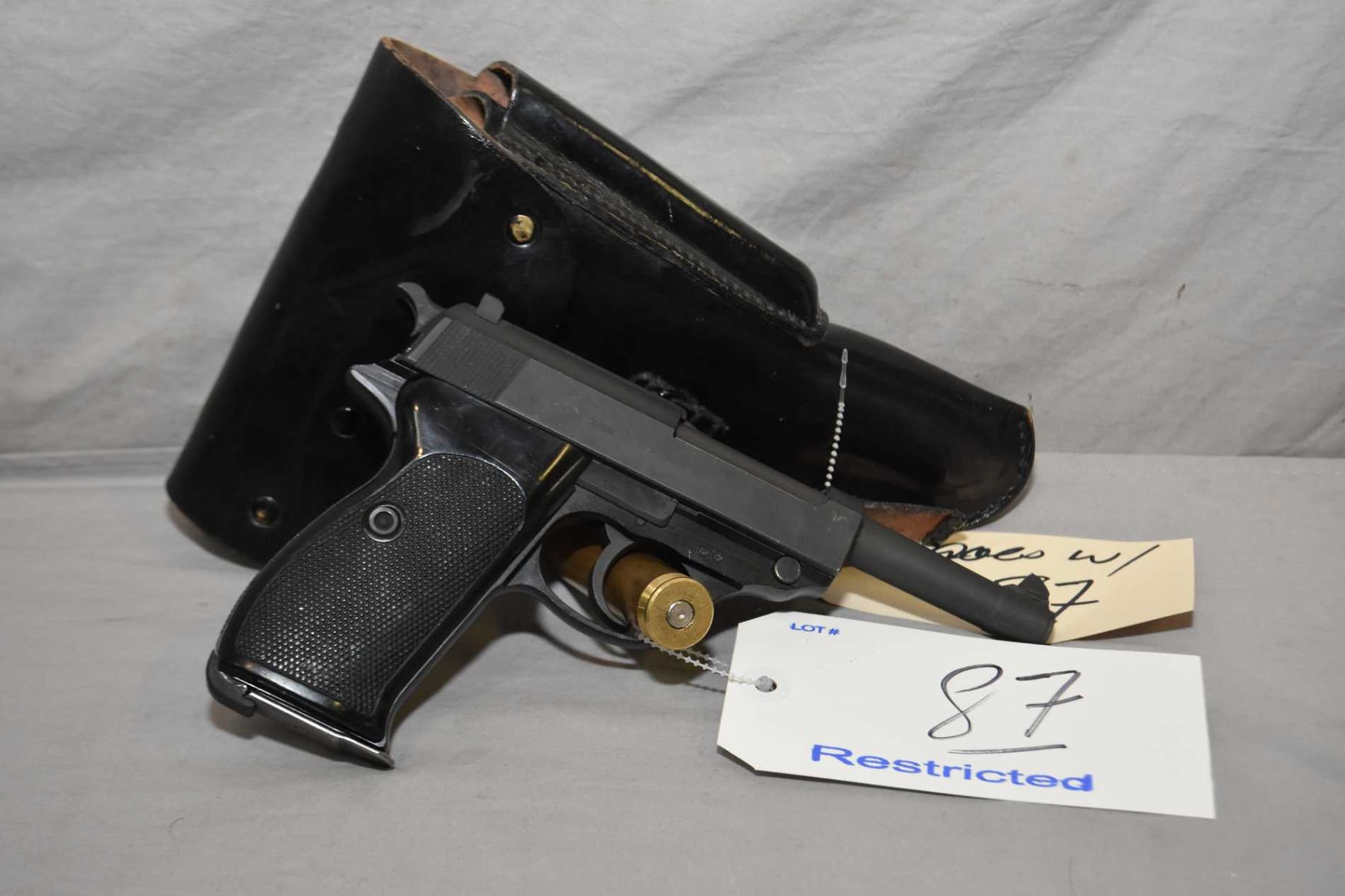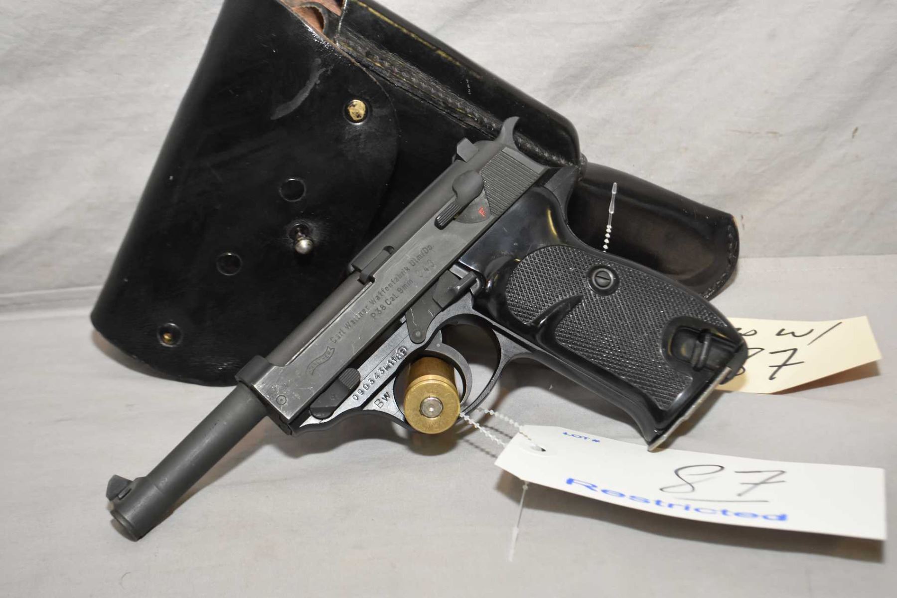 Walther ( by Walther ) Model P38 .9 MM Luger Cal 8 Shot Semi Auto Pistol w/ 125 mm bbl [ two toned flat blued finish barrel and slide, shiny black receiver, good black checkered grips, few slight marks, c/w East German Post War leather holster, correct for a P-1/ P38 ] Ser # 090343 Restricted Handgun Cert # 11319347 FRT # 38427 - 2
