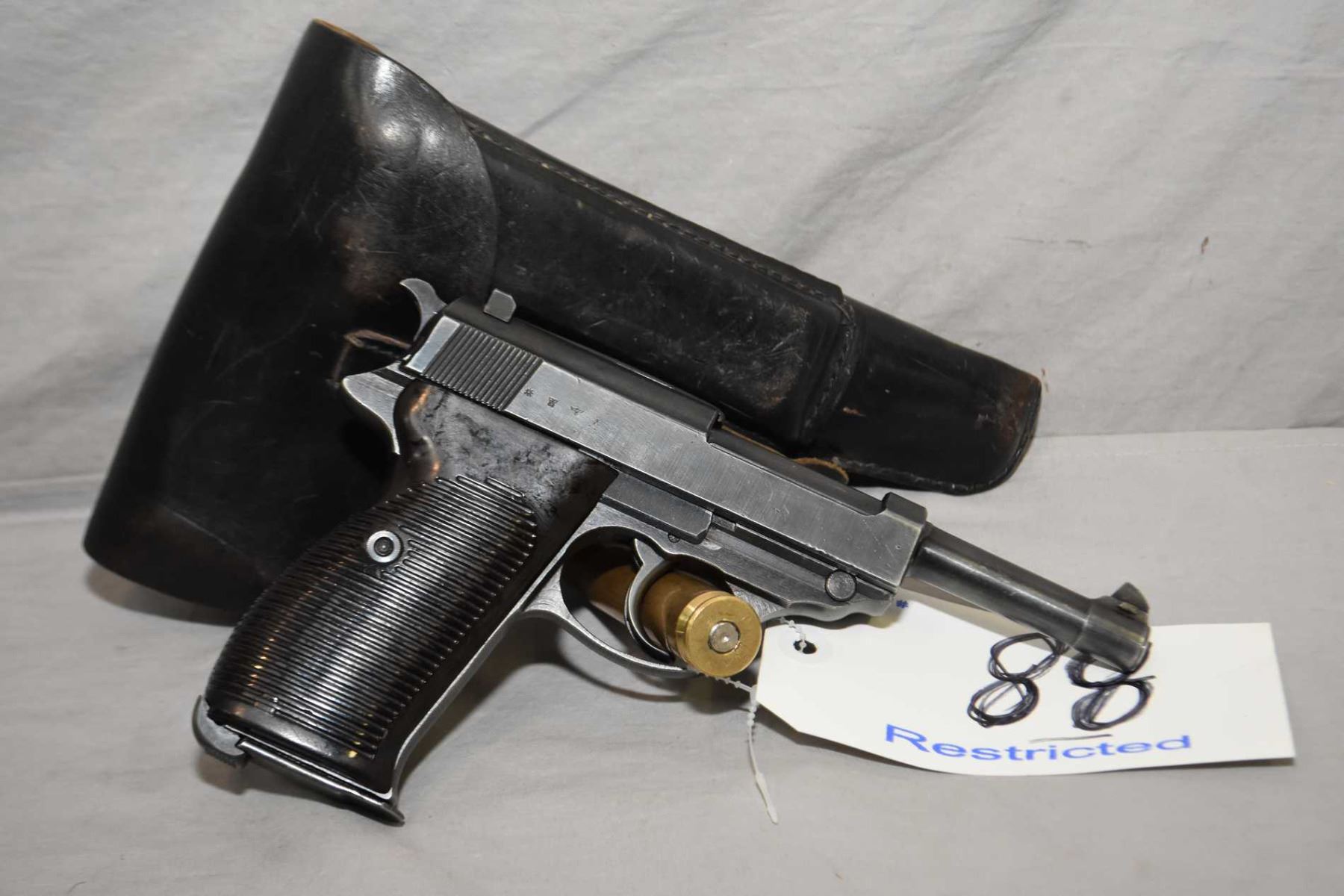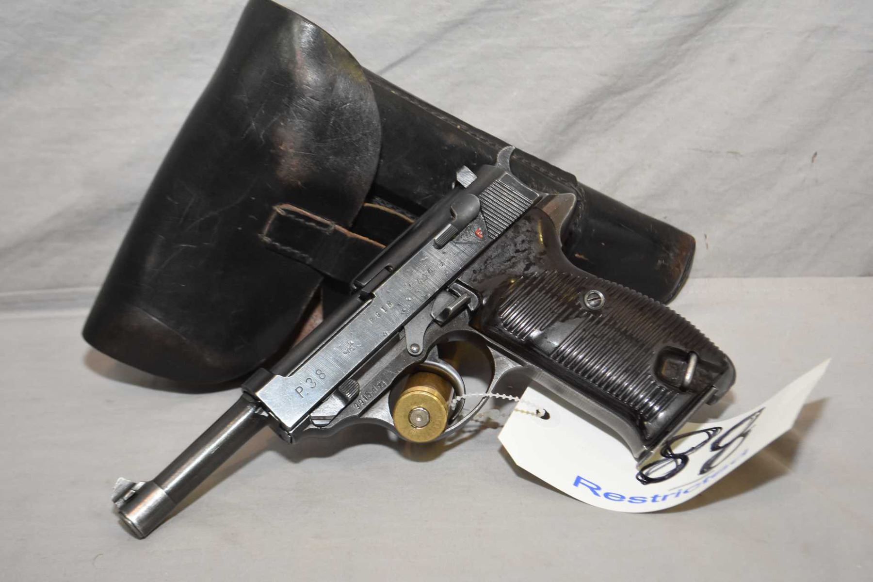 Walther ( cyq Spreewerk ) Model P38 .9 MM Cal 8 Shot Semi Auto Pistol w/ 125 mm bbl [ blued finish, starting to fade in some areas, slight holster wear, good grips, Nazi marked with WaA88 German Army acceptance, reserialized period armies slide soft shell P38 holster marked WaA 938 with excellent stitching ] Ser # 9915 Restricted Handgun Cert # 11902039 FRT # 23310 - 2