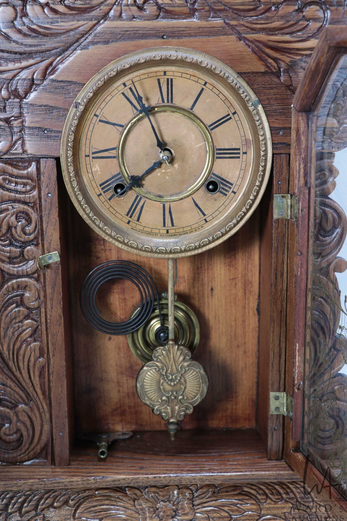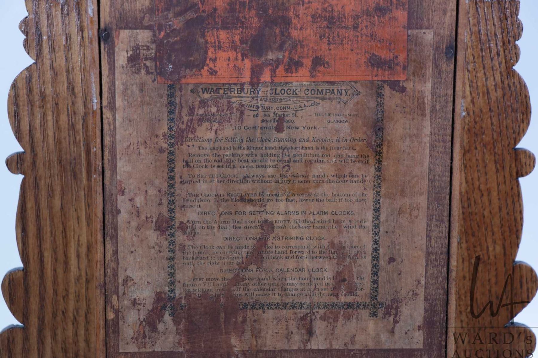 Waterbury oak cased gingerbread clock with chiming movement and decorative pendulum, circa 1900, working at time of cataloguing