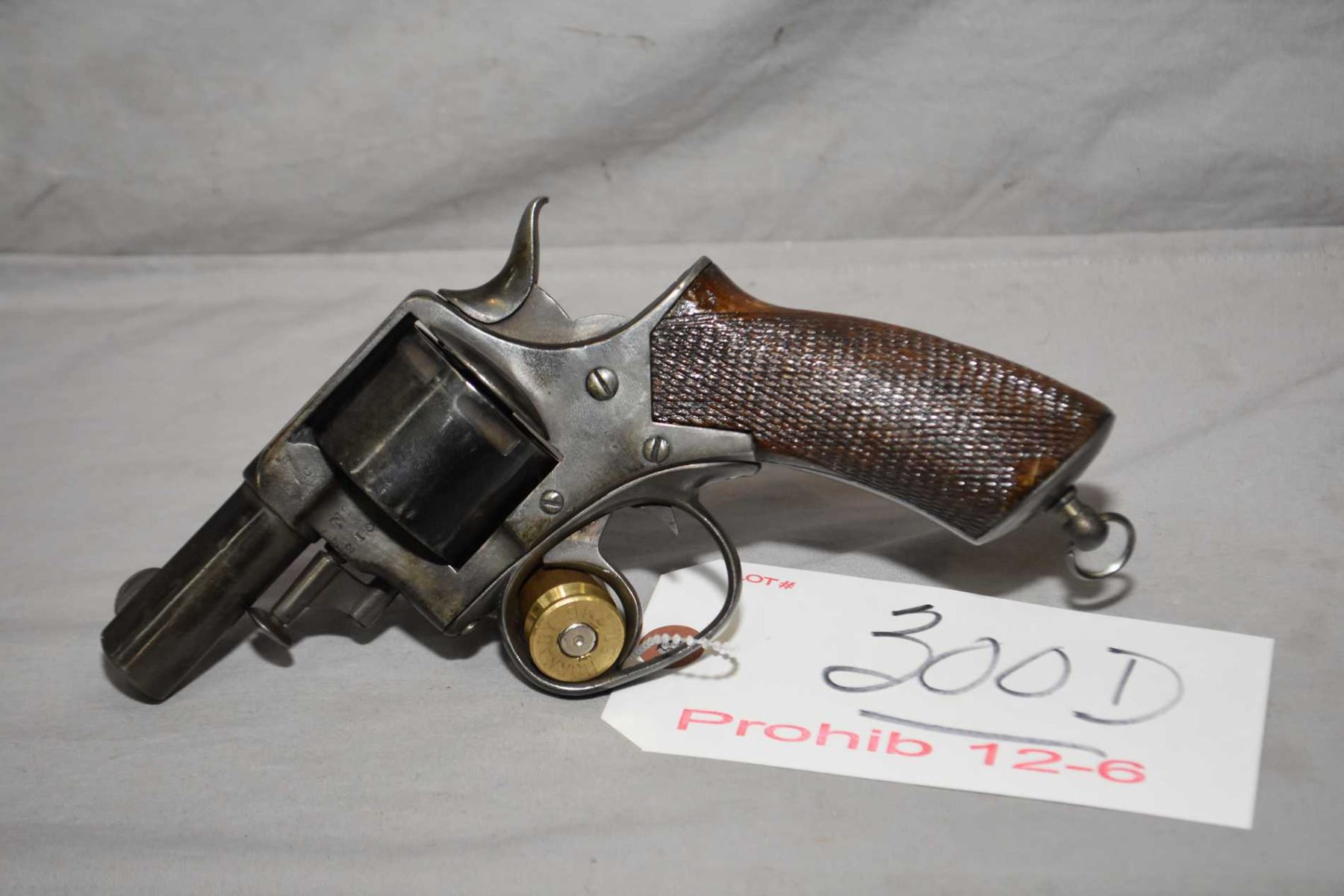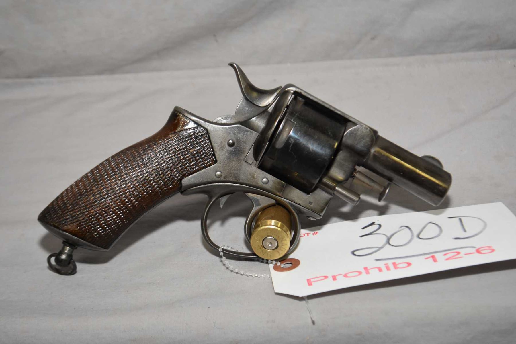 Webley Model RIC No. 1 .455 Rev Cal 6 Shot Revolver w/ 63 mm bbl [ fading blue finish, barrel marked W.J. Hill Who was an English Manufacturer between 1860 and 1897, varnished checkered grips, with lanyard ring, could possibly get de - registered, Note : trigger return spring doesn't work, needs work ] Ser # 2105 Prohib 12 - 6 Cert # H - 238921 Old Green Sheet FRT # 25055 - 11 EXPECT DELAYS IN TRANSFER