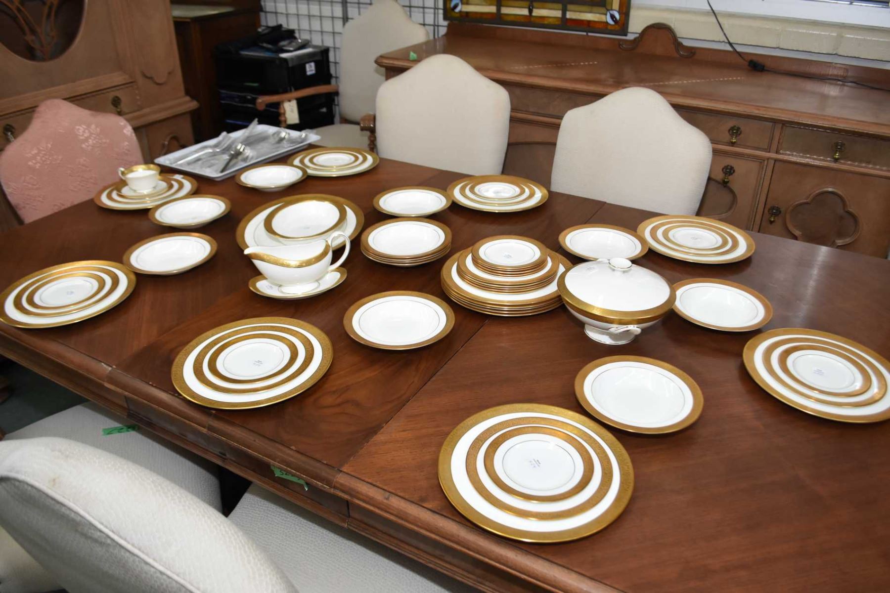 Wedgwood "Ascot" china tableware including settings for twelve of dinner plates, luncheon plates, bread and butter, soup bowls, one open vegetable dish, one covered vegetable dish, platter, gravy boat with tray and one cups and saucer plus selection of Oneida stainless flatware for twelve NOTE: Not available for shipping. Local bidders only