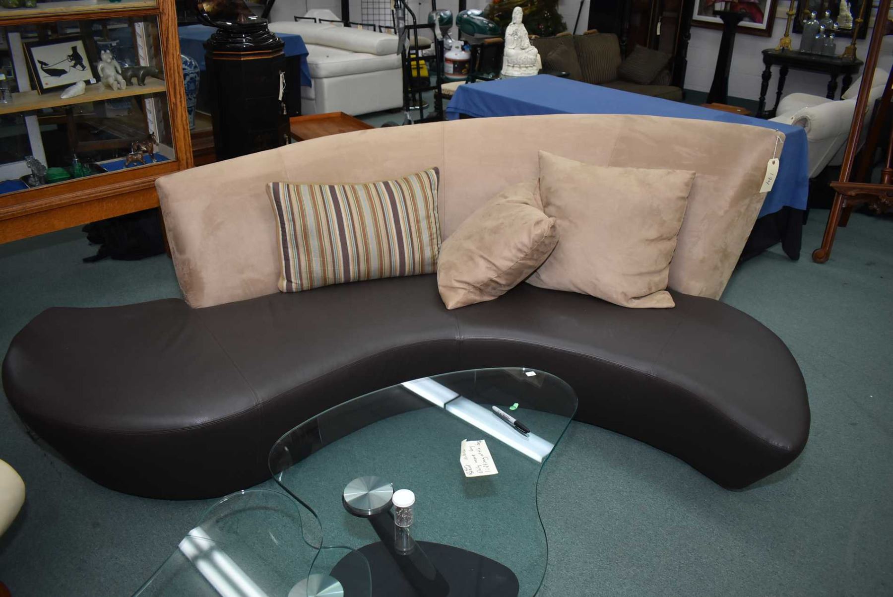 Weiman designer gia sofa in leather and suede with three throw cushion, originally retailed with lot 175 for $19, 477 CAD