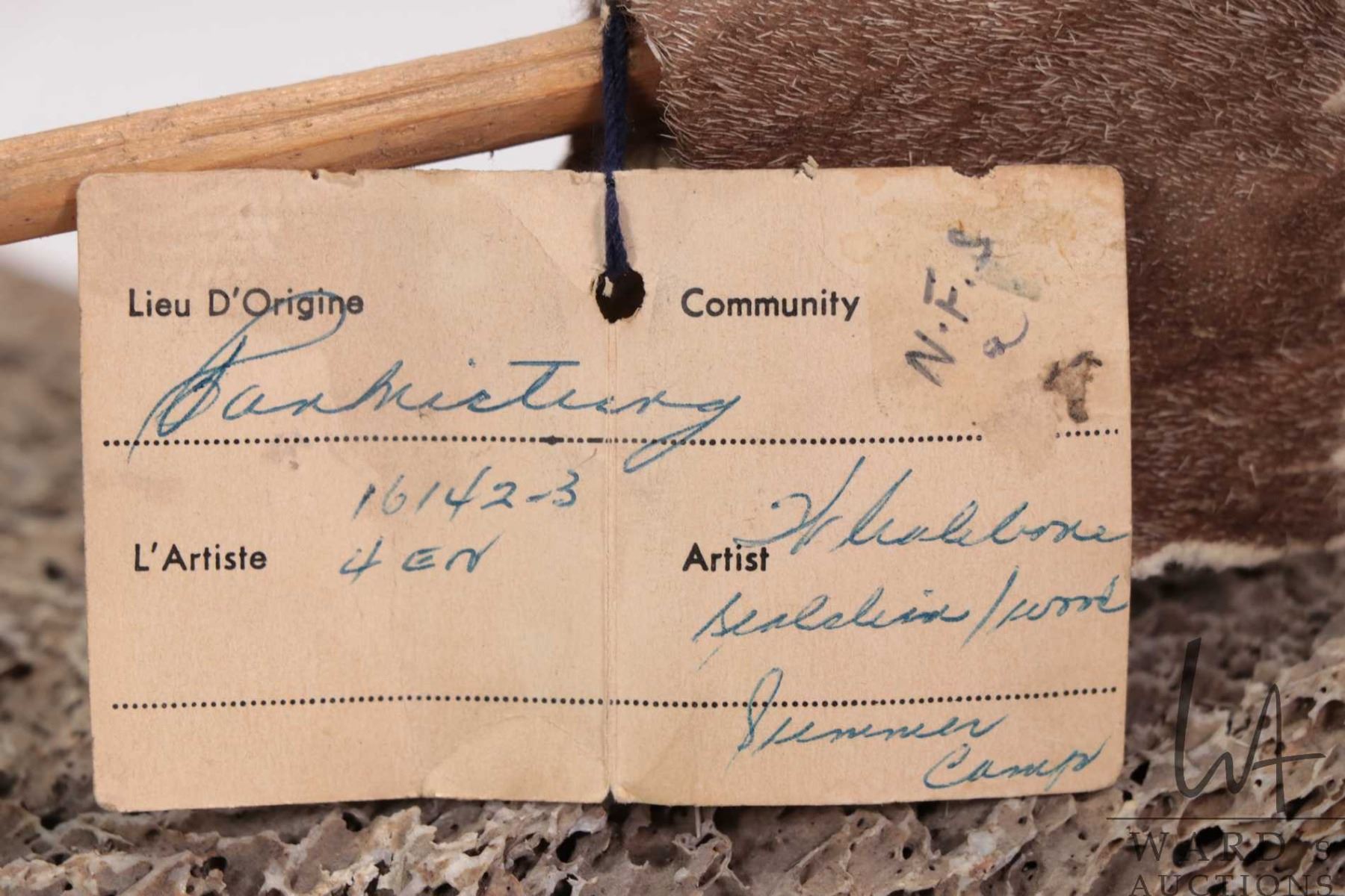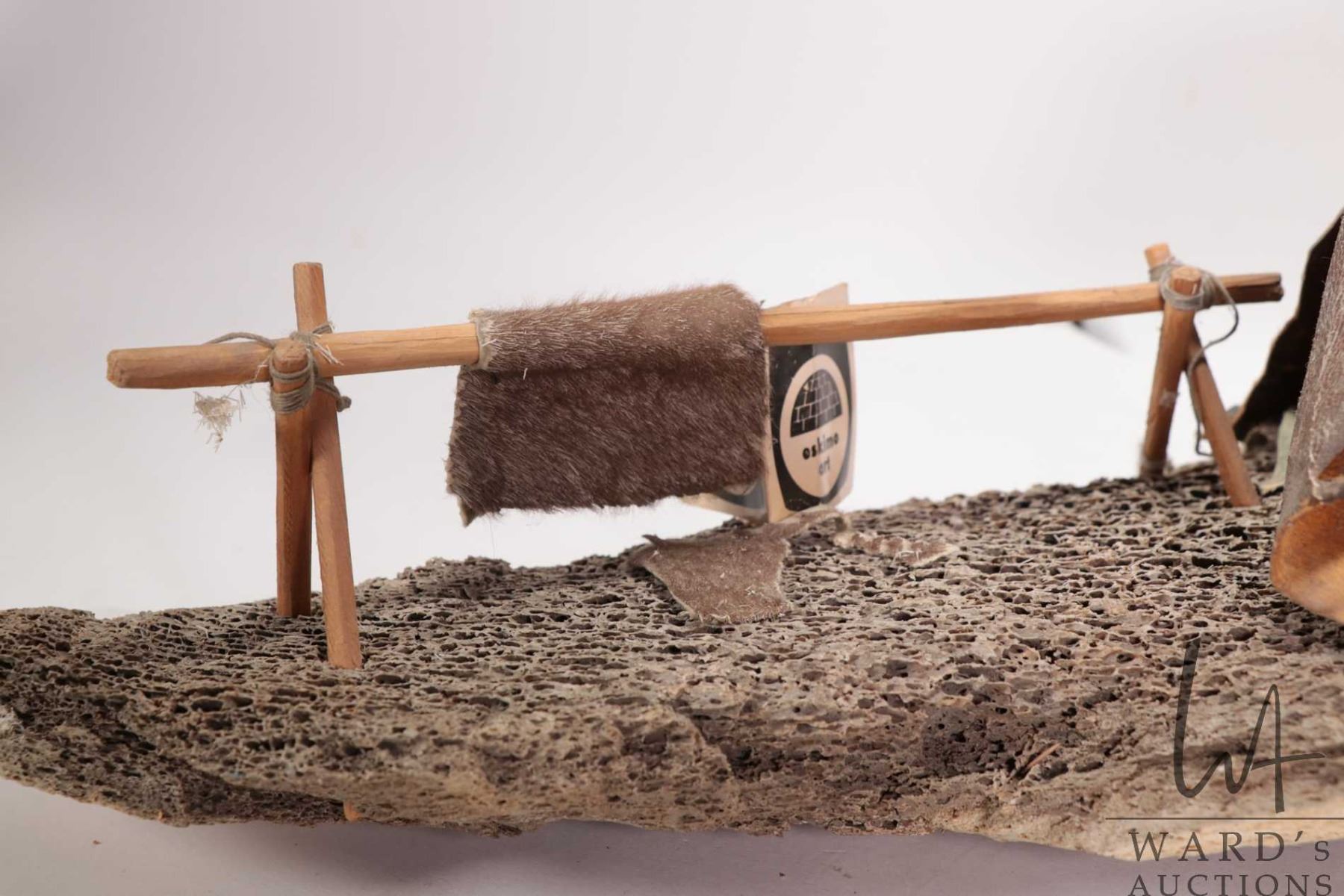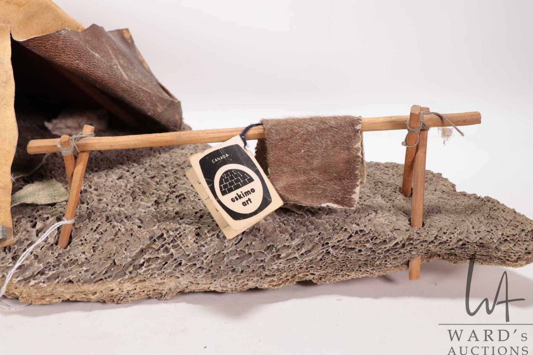 Whale bone, seal skin and wood sculpture titled "Summer camp" Eskimo Art label artist no. 16142-3, P