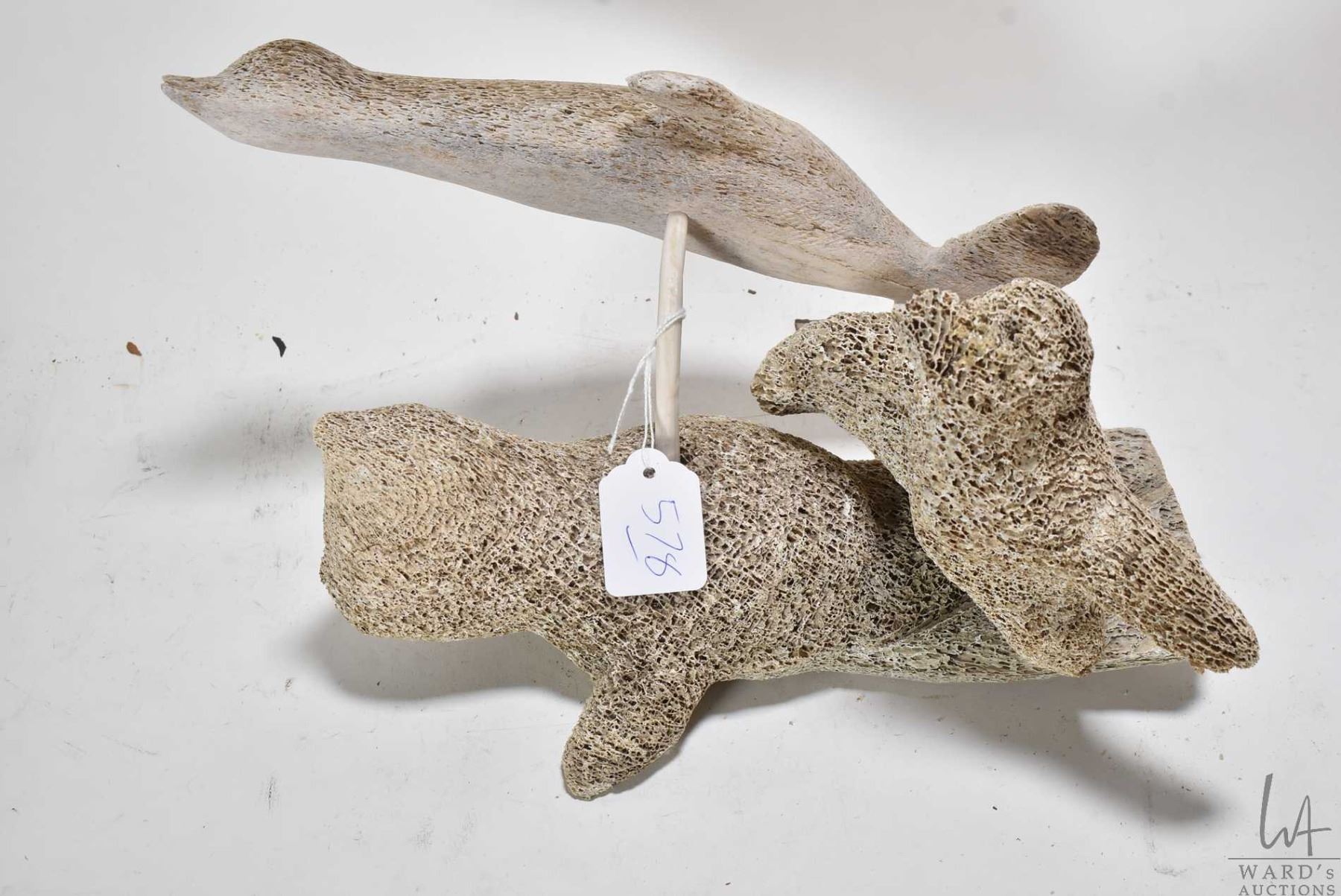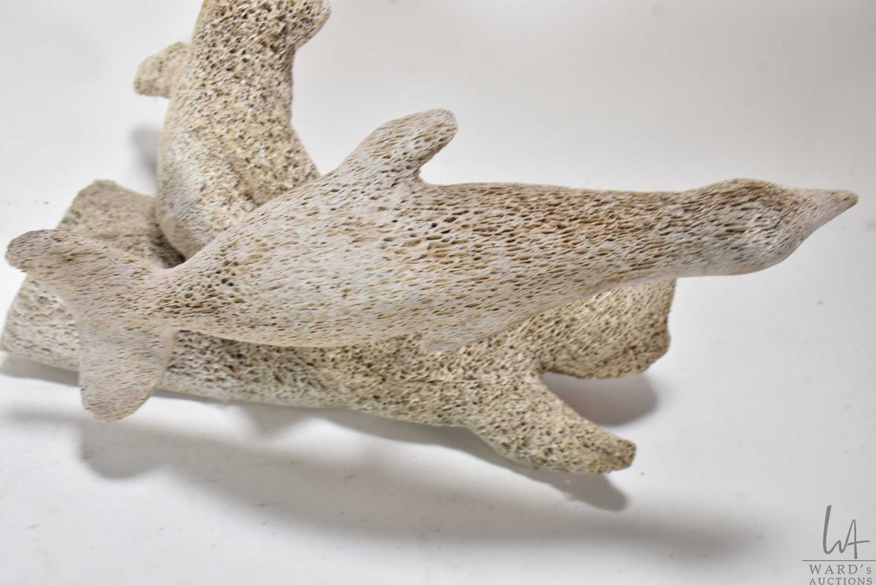 Whale vertebrae carving of three swimming figures, no signature found 12" in length