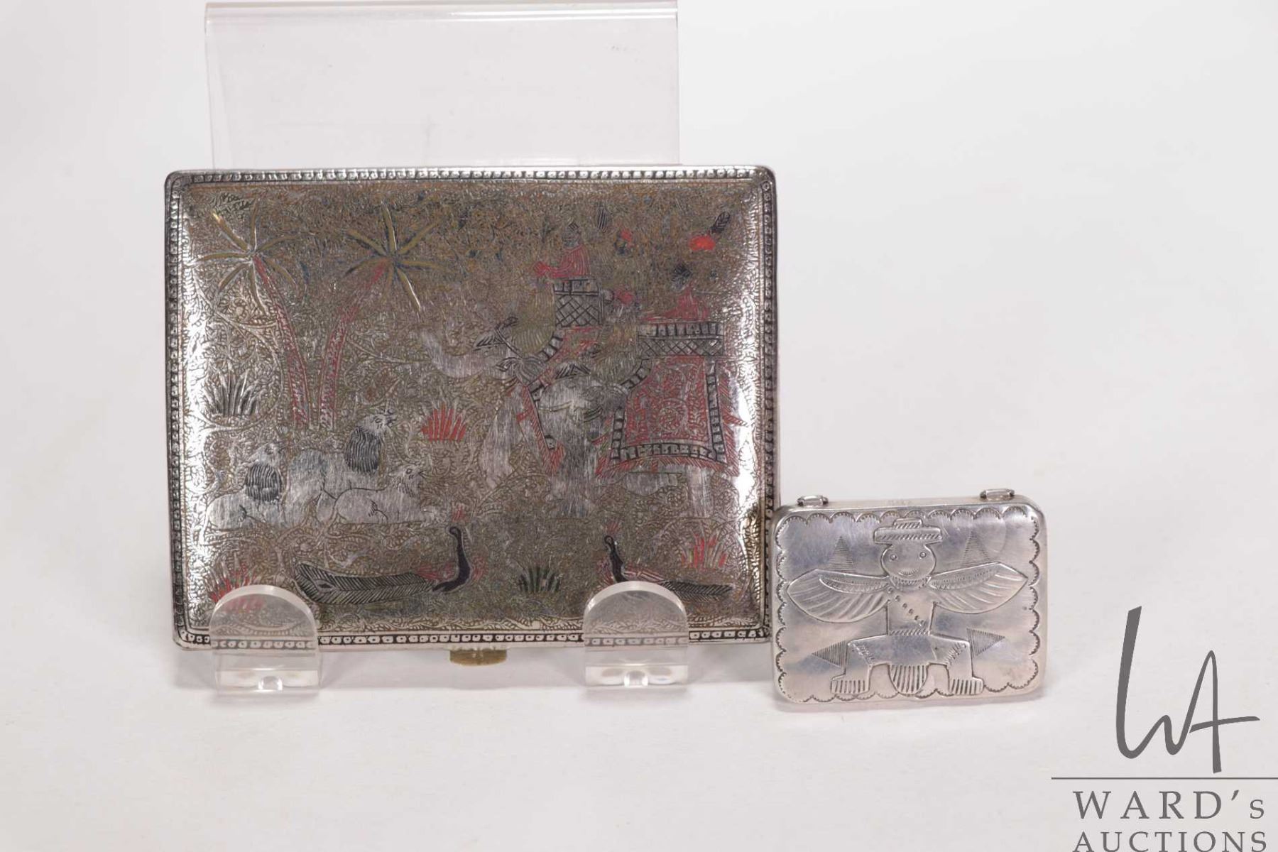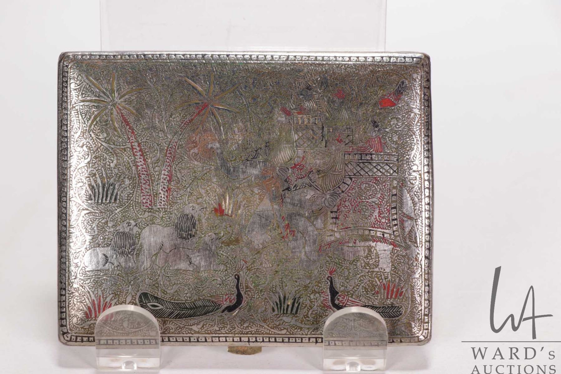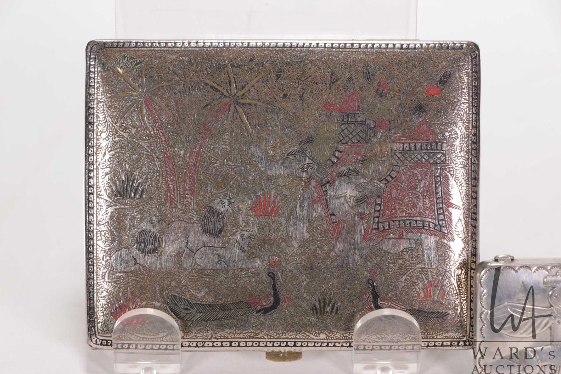 White metal and enamel Indian cigarette case featuring elephants and lions and a small stamped pill box