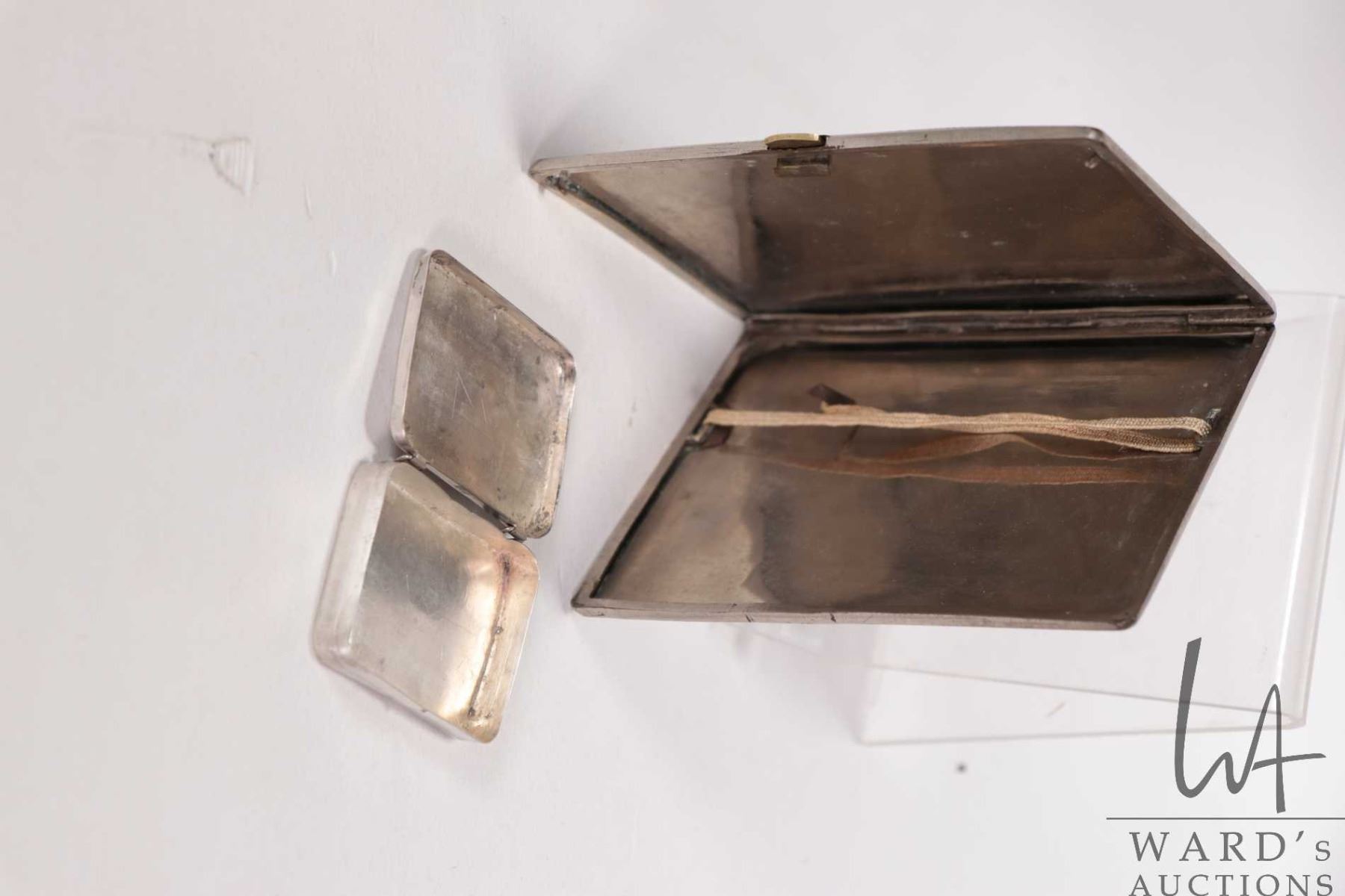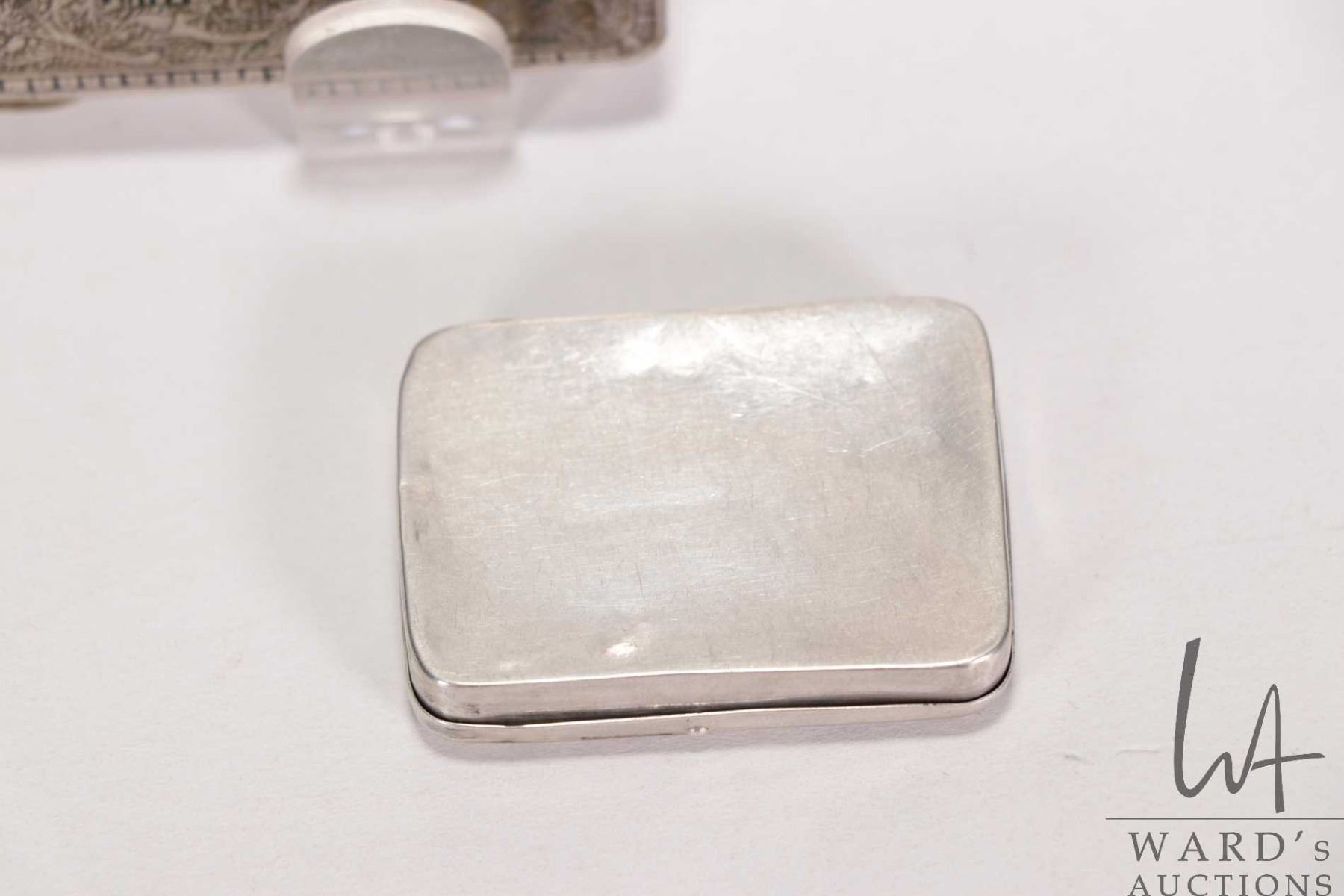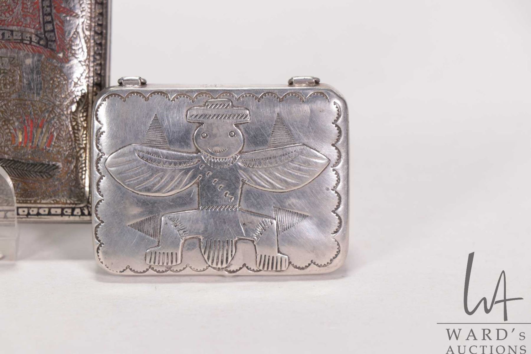 White metal and enamel Indian cigarette case featuring elephants and lions and a small stamped pill box