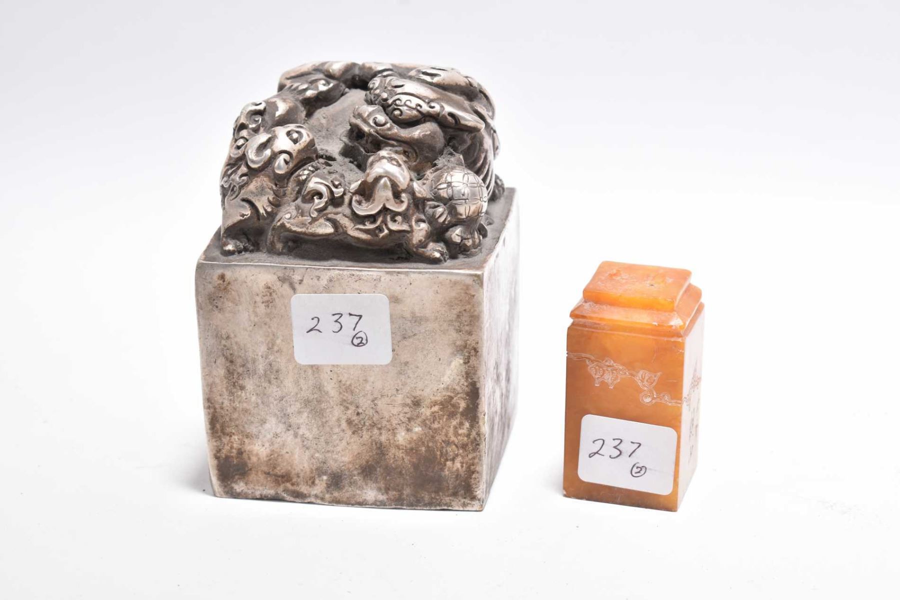 White metal heavy lion stamp 3" square and an Oriental yellow soapstone signature seal