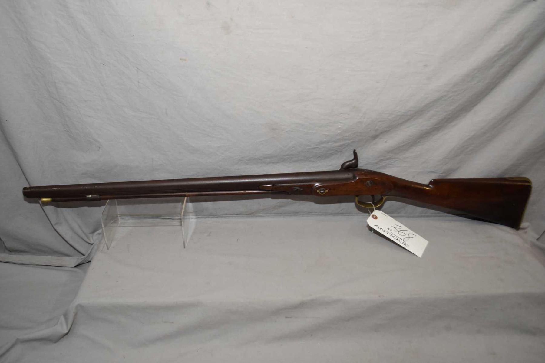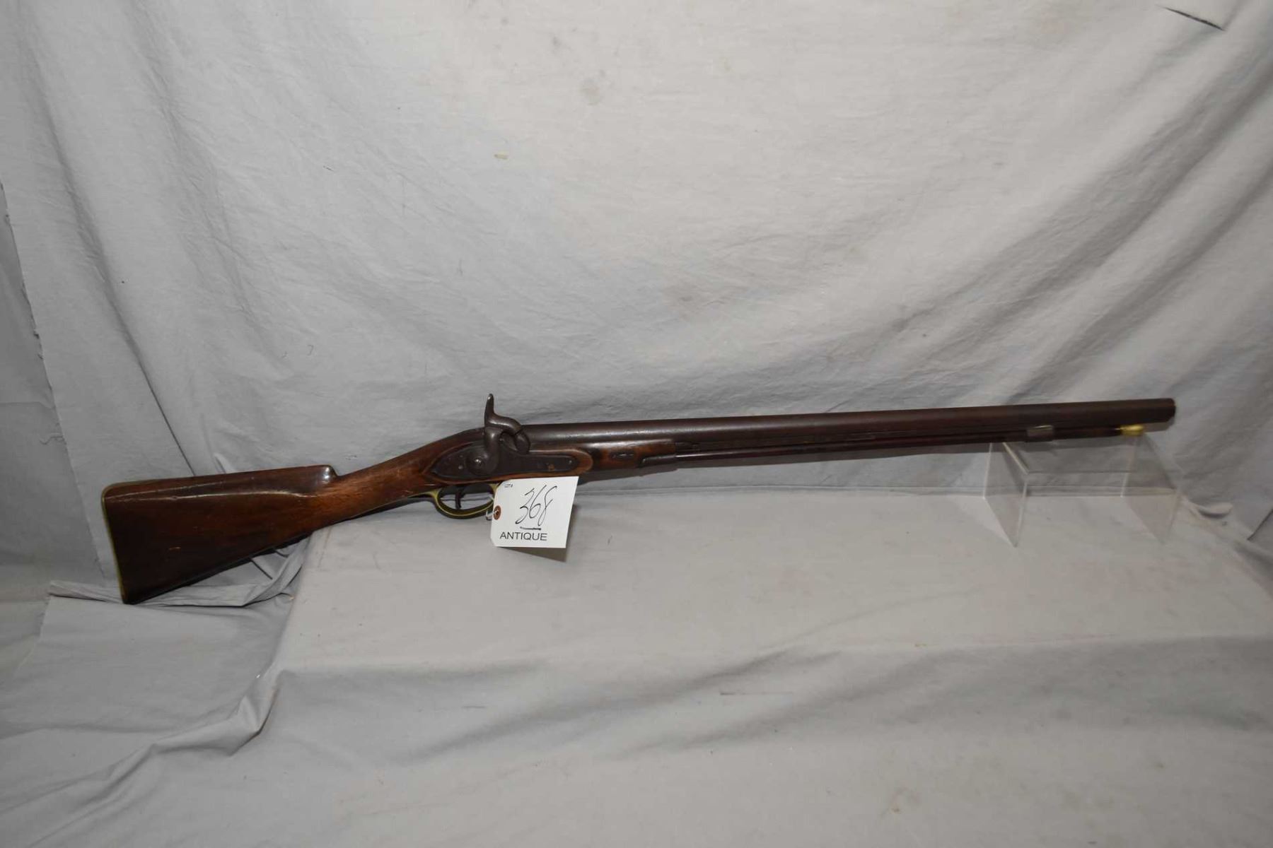 Wilkinson London Model Half Stocked Fowler .69 Perc Cal Single Shot Fowler w/ 26" round bbl [ blued finish turned brown with some light pitting, Wilkinson London marked lock, with large hammer, brass trigger guard and butt plate, brass tipped wooden ramrod, wood cracked on left side back from the forend, which was horn tipped but missing the right side half, rod band missing and the one that is on the firearm is sodered, Circa 1804 - 1818 ] ANTIQUE NO PAL REQ