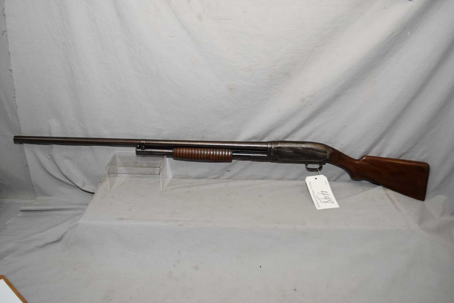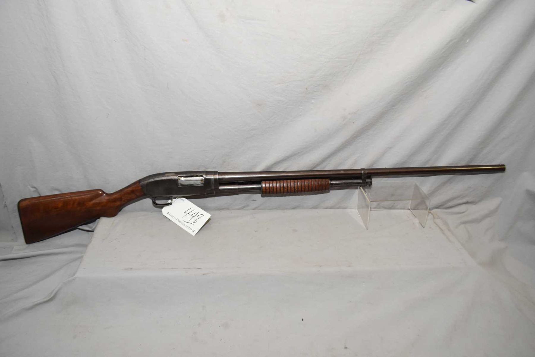 Winchester Model 12 .12 Ga 2 3/4" Pump Action Shotgun w/ 32" bbl full choke [ fading blue finish, barrel turning plum color, receiver has finish streak removed possible from blood or poor storage, mostly on left side, good pistol grip stock w/ grooved forend, Winchester Repeating Arms butt plate, Circa 1929 ] Ser # 592423