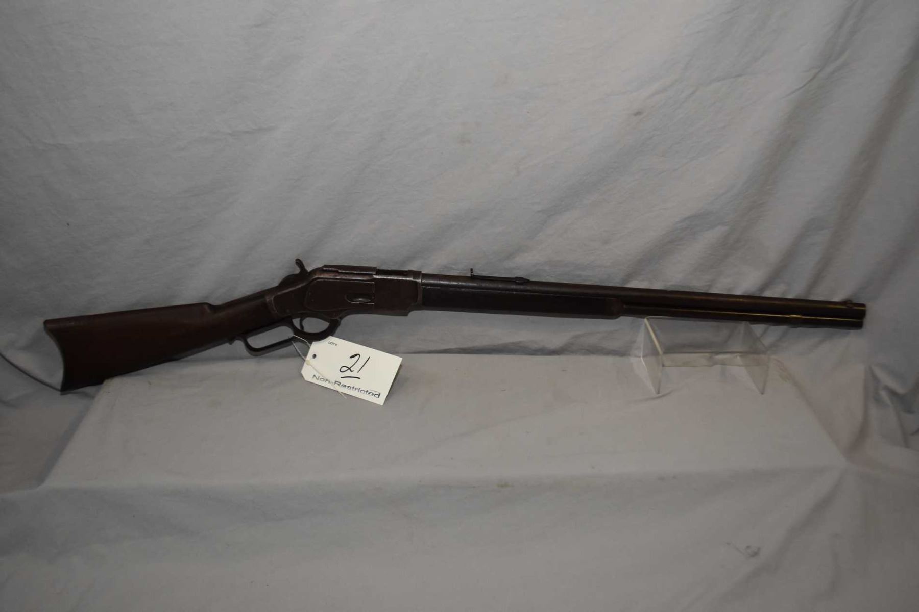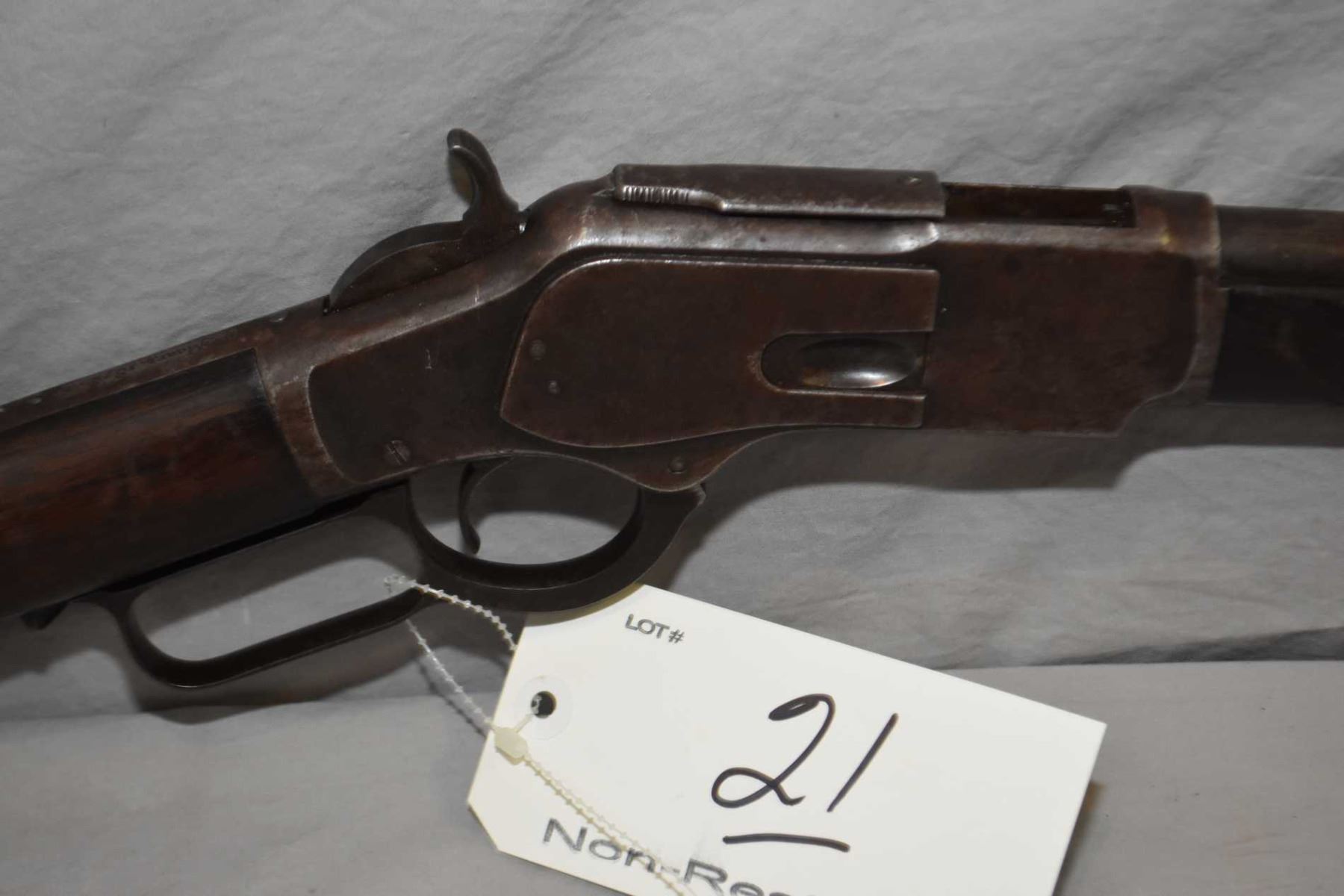 Winchester Model 1873 3rd Model .38 Cal Lever Action Rifle w/ 24" round barrel full mag ( muzzle appears accurized ) [ mottled patchy blued finish turned brown, barrel sights, missing the lift, with dust cover, butt stock cracked and repaired thru at wrist with two screws, crescent butt plate with trap, various marks and scratches to wood and metal, Circa 1883 ] Ser # 110887A
