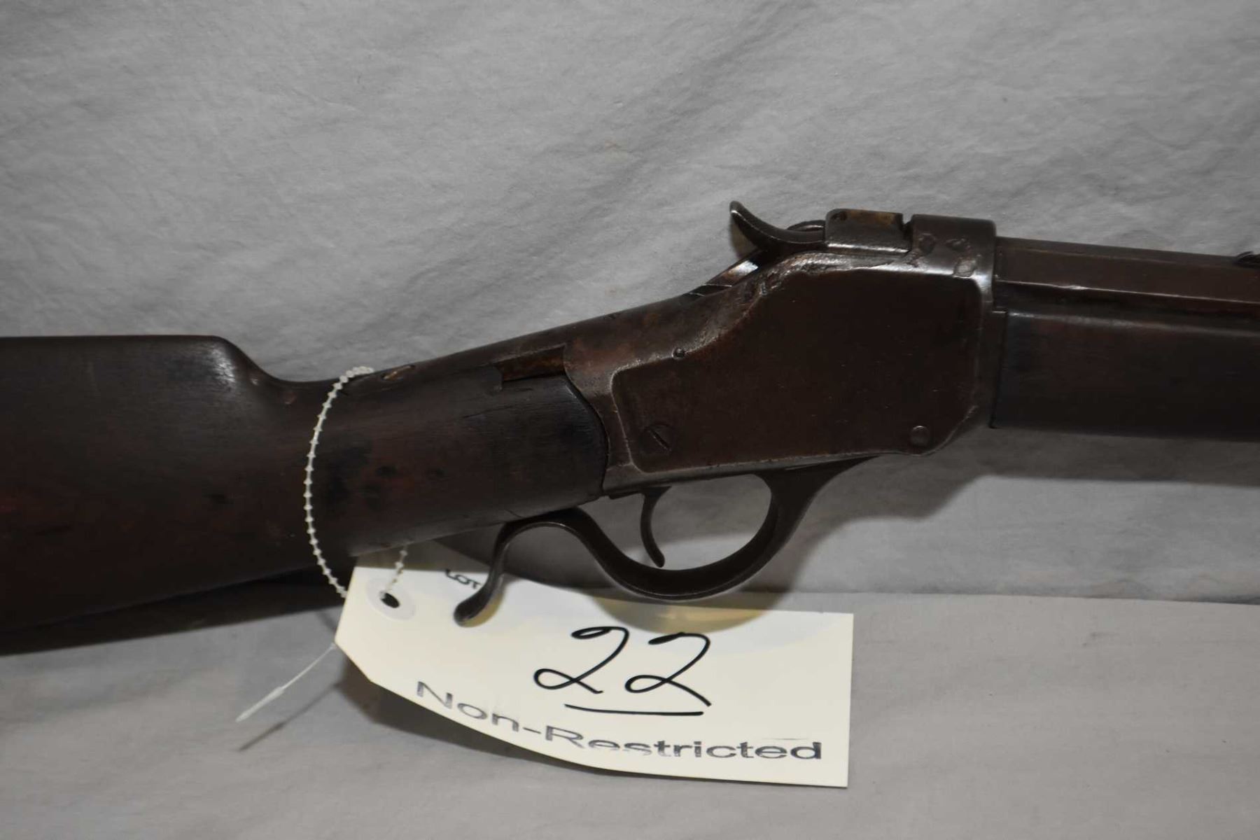 Winchester Model 1885 Hi Wall .38 WCF Cal Single Shot Falling Block Rifle w/ 28'" octagon bbl [ mottled blued finish turning brown, with barrel sights, some pitting mostly to receiver, lever, butt stock chipped, cracked and repaired behind upper tang and lower tang, just about full length of the stock, large sliver missing right side of ebony tipped forend, crescent butt plate, missing lower tang screw, Circa 1887 3rd Year of Production ] Ser # 8132