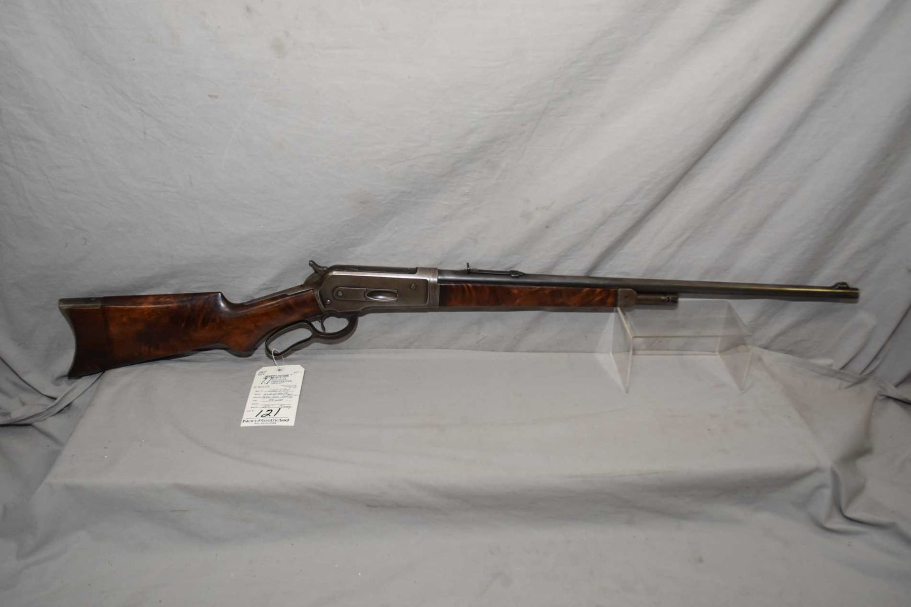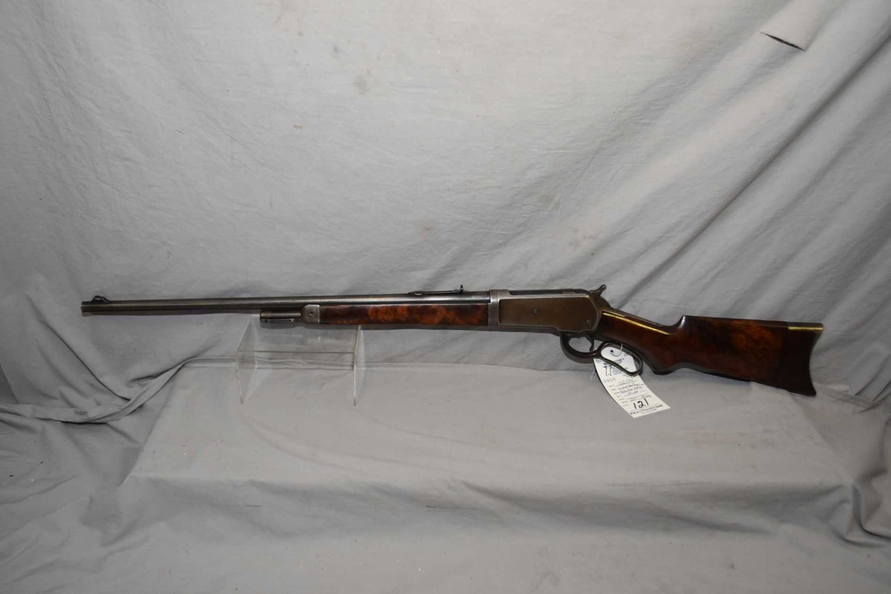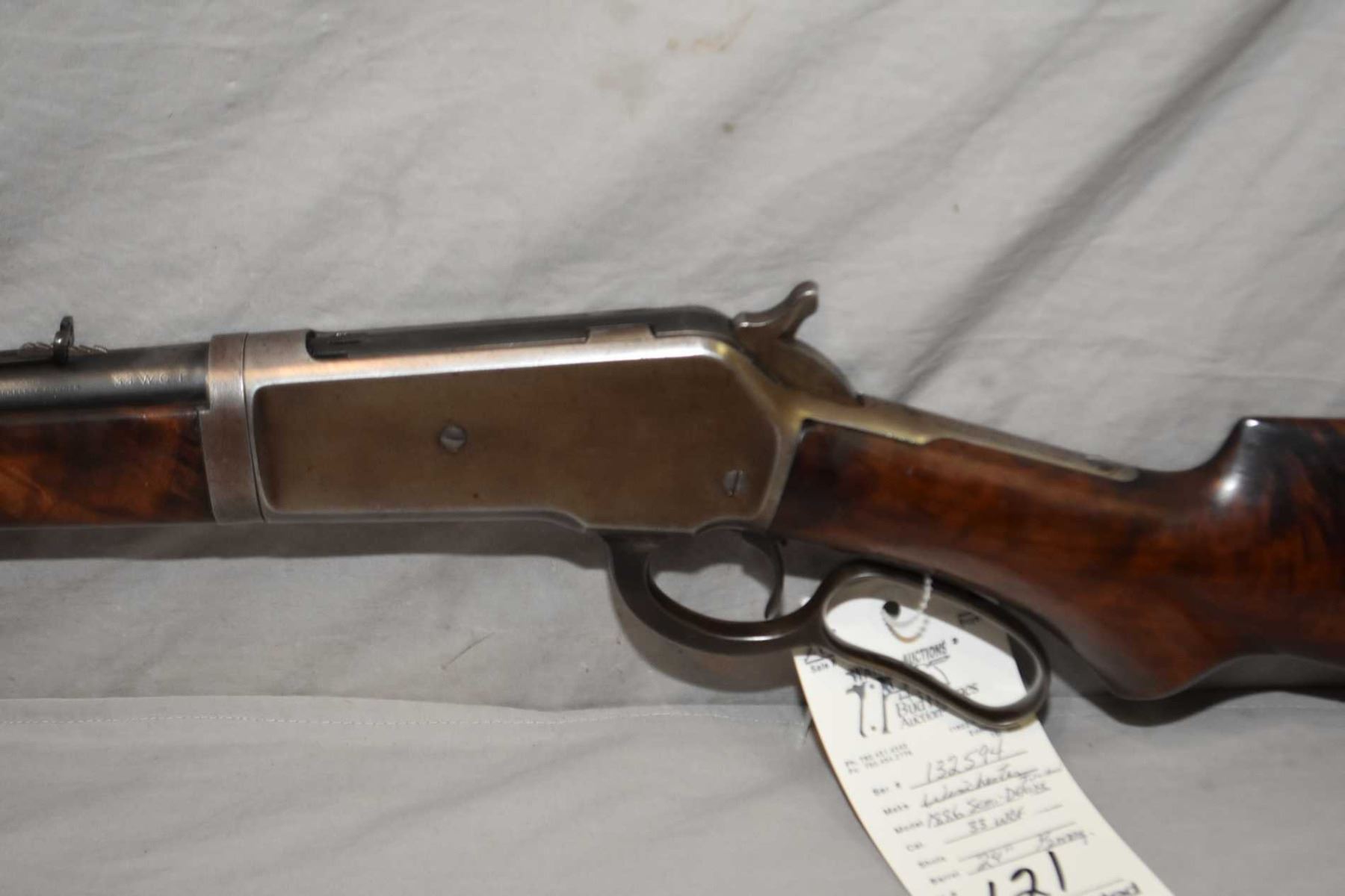 Winchester Model 1886 Semi Deluxe Take Down .33 WCF Cal Lever Action Rifle w/ 24"light weight round barrel half mag [ fading blue finish, barrel sights, with set trigger, double X wood, note : butt stock has been repaired at butt and comb, with a metal crescent butt plate, traces of fading case color turned silver, mostly on the lever, good deluxe forewood, shows some wear by nose cap, ebony insert in pistol grip cap, note: wood is not checkered, but is delxue, would have had to been ordered special like this, as most came checkered from the factory, Circa 1904 ] Ser # 132594