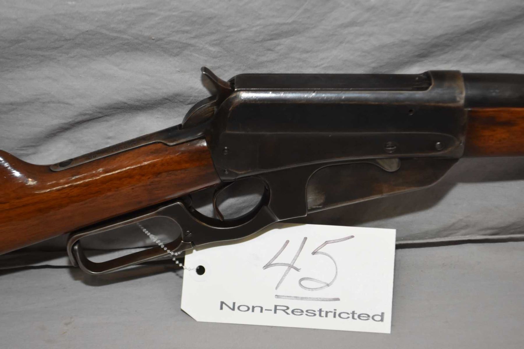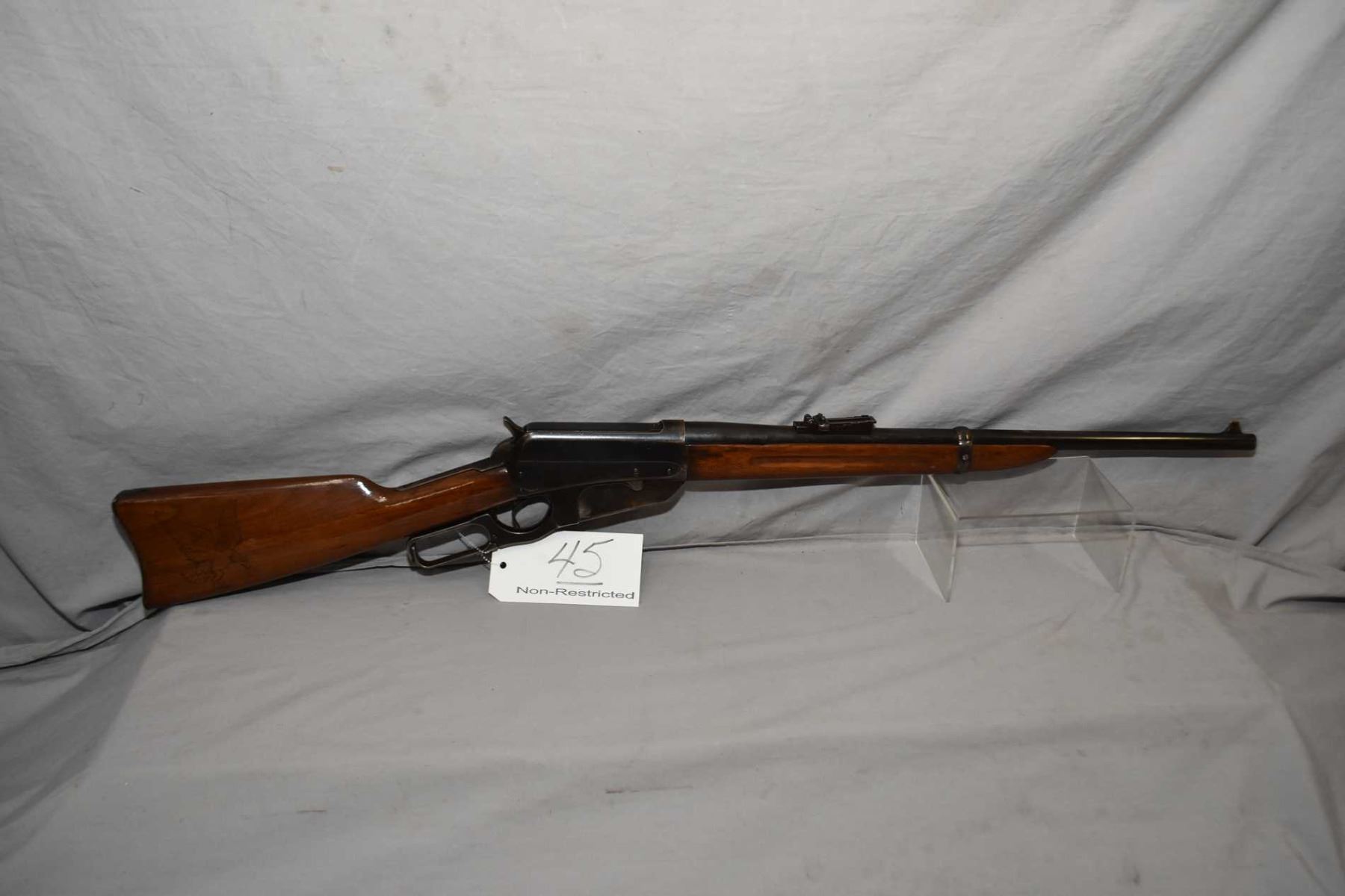 Winchester Model 1895 .30 US - 06 Cal Lever Action Saddle Ring Carbine w/ 22" bbl [ fading reblued finish with some marks and scratches, barrel sights, revarnished wood with Eagle carved right side butt stock, carbine butt plate w/ trap, fluted forend, with gouges both sides of barrel band, Circa 1925 ] Ser # 413745